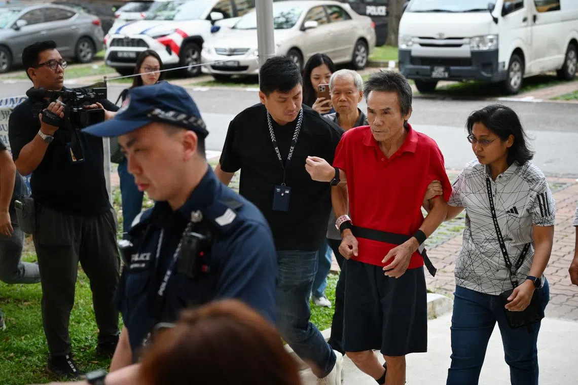 Ng Chen Heng, 66, who has been charged with murder, being taken back to the crime scene in Ang Mo Kio by police on Jan 21.