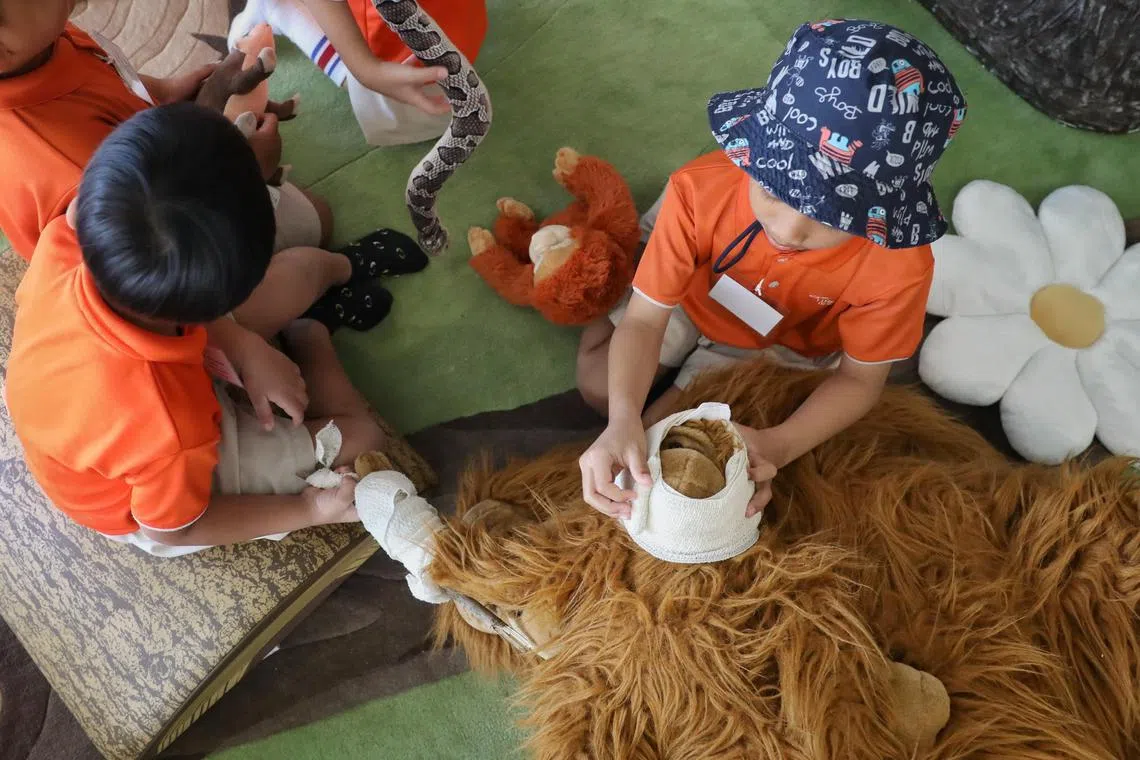 Children bandaging an orangutan stuffed toy at ZooSchool during its launch on May 16.