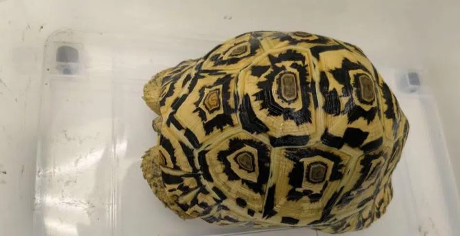 A leopard tortoise was among 16 wildlife specimens seized during an NParks raid on Oct 9, 2025.