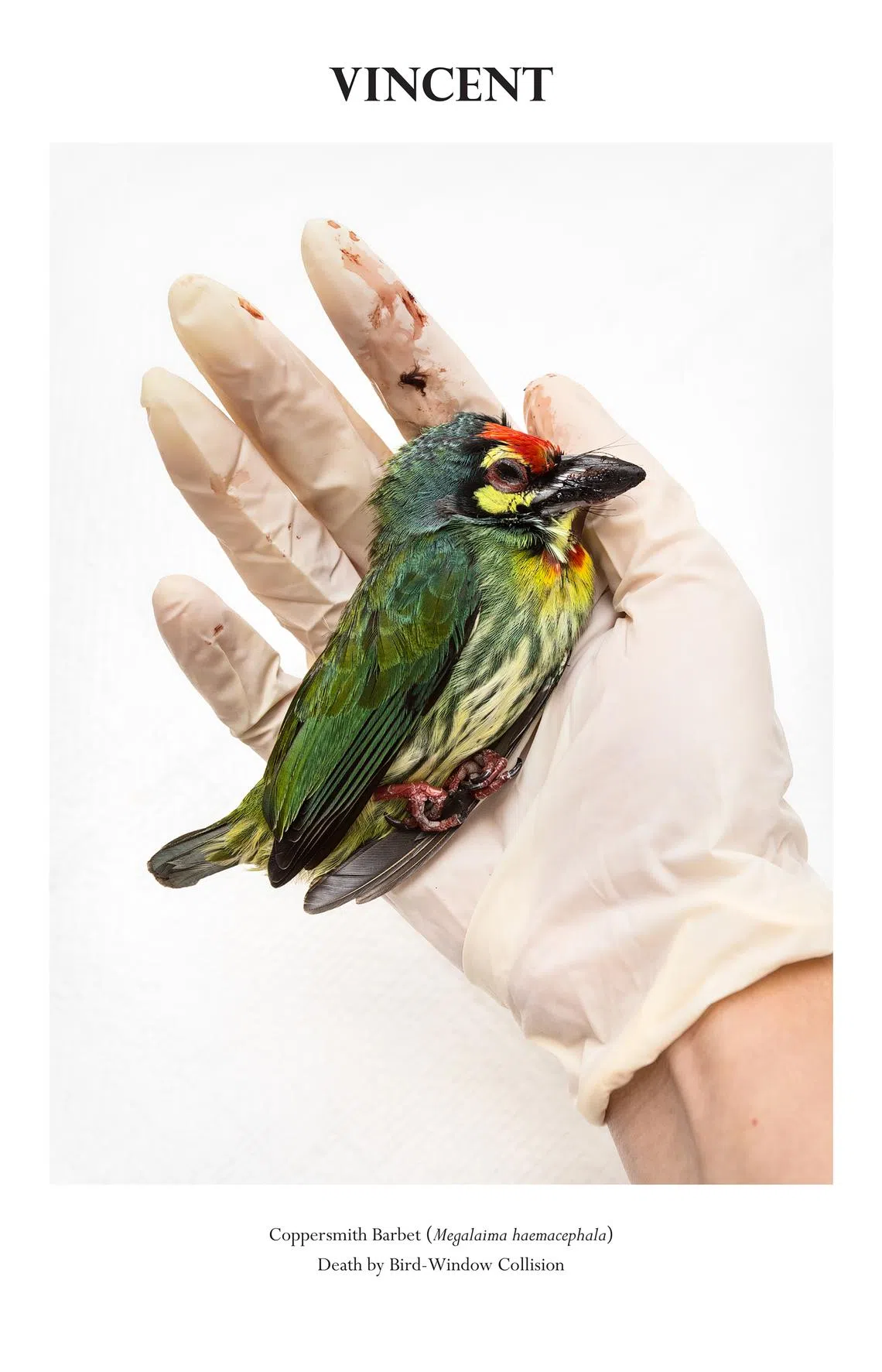 The Coppersmith barbetis one of three barbet species commonly found in Singapore. They may be hard to spot, but their distinctive call – a repetitive “tonk-tonk-tonk” that resembles a coppersmith striking metal with a hammer – is unmistakable. She recalled: “Although I began shooting only in 2017, some carcasses that I have photographed date back to 2014 to 2015. For example, this coppersmith barbet died in 2015 but was kept for research purposes in the National University of Singapore.”