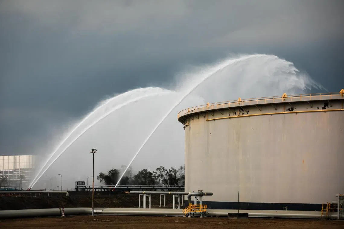 SCDF and ExxonMobil deploying four large monitors to tackle oil tank fires during the large storage oil tank firefighting scenario for Exercise Northstar XI on Jurong Island, March 22, 2023.