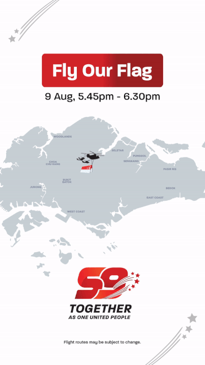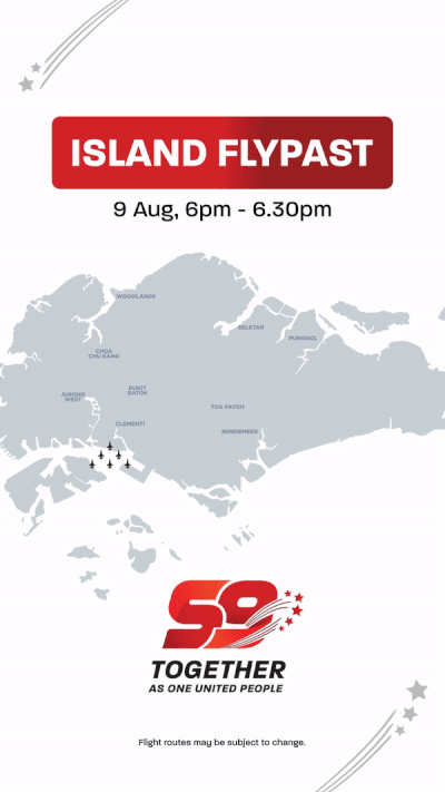 While the helicopters are making their way across the island, six F-16 fighter jets will be involved in the Island Flypast around Singapore covering Clementi, Jurong West, Choa Chu Kang, Bukit Batok, Woodlands, Toa Payoh, Seletar, Punggol and Bendemeer.