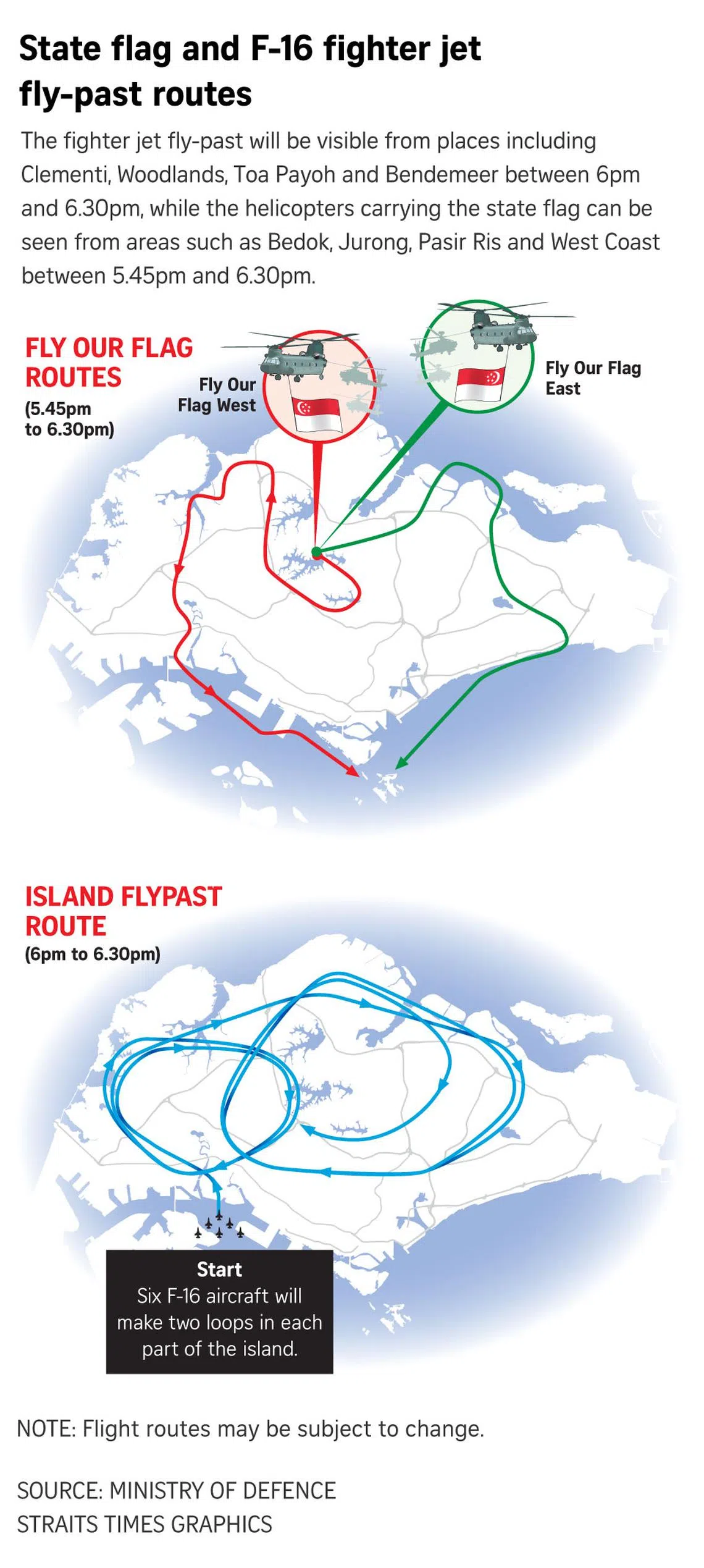 The helicopters with the state flag will fly closer to Bedok and Jurong, while the jets will be seen nearer to Clementi, Queenstown and Bendemeer.