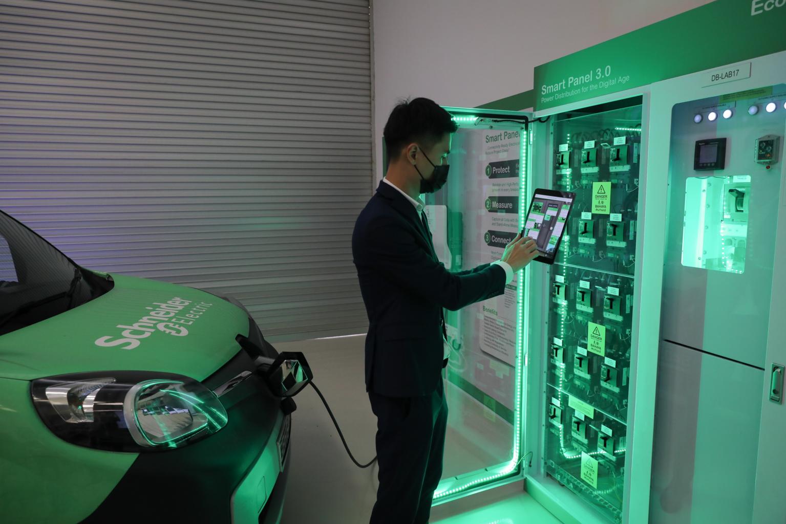 Among the exhibits displayed at the centre is an EVlink Wallbox developed by Schneider Electric to regulate the amount of electricity allocated to EV charging such that buildings have sufficient electric supply capacity.