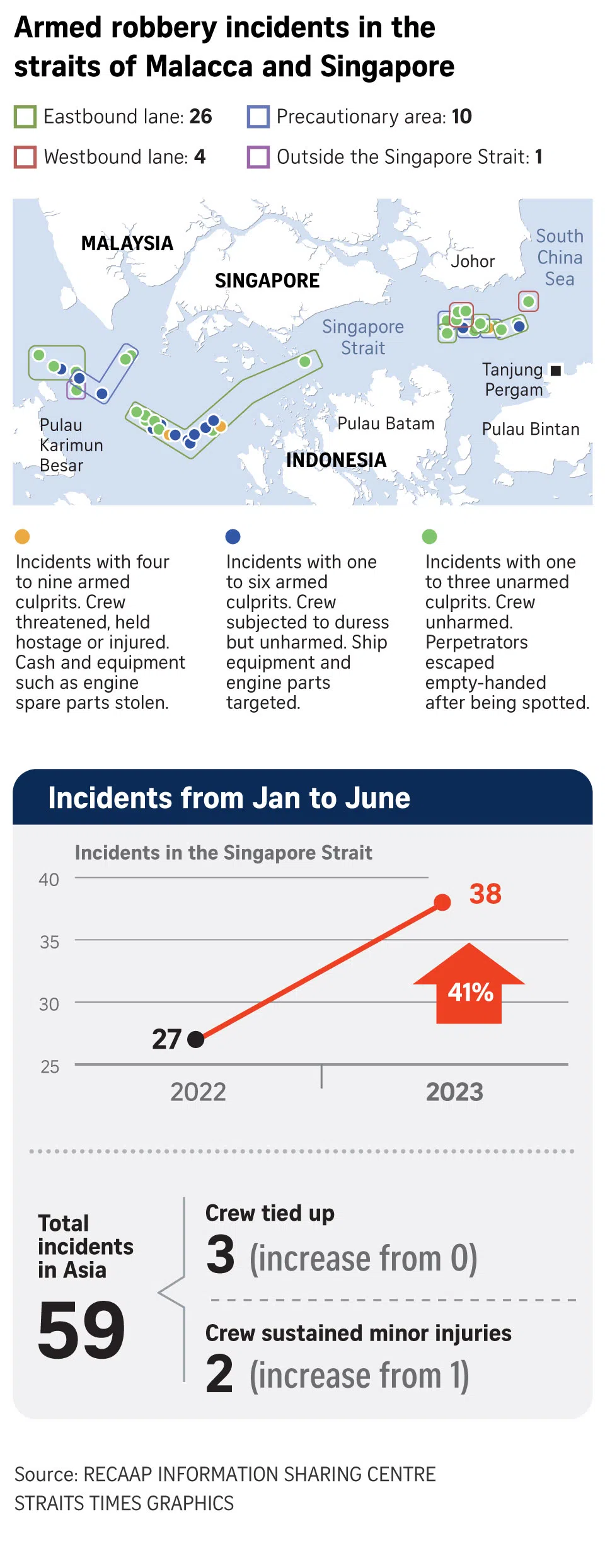 The rise in incidents in the Singapore Strait south of the Republic mirrored an increase in cases of armed robbery in Asian waters, with 59 reported incidents in the first half of 2023 compared with 42 for the same period in 2022.