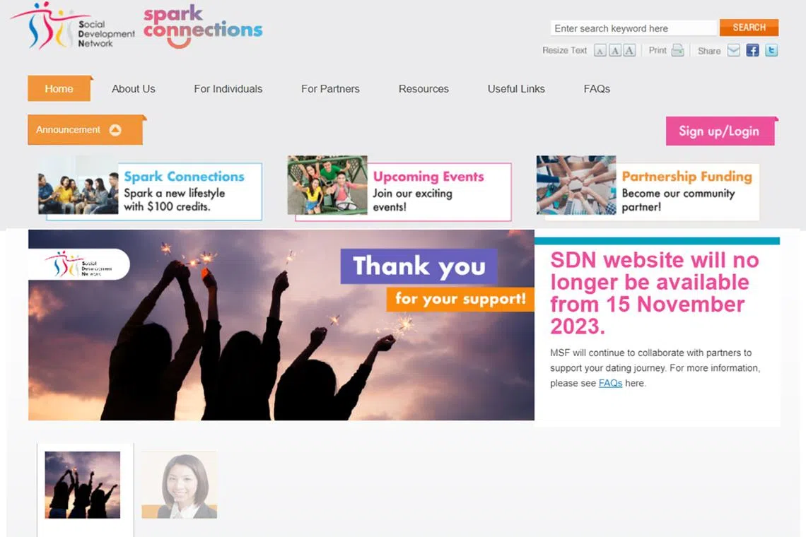 SDN’s Web address now points to a one-sentence write-up on the Ministry of Social and Family Development’s (MSF) website that it “works with partners in the private, people and public sectors to promote a conducive landscape for singles to meet and form meaningful relationships”.
