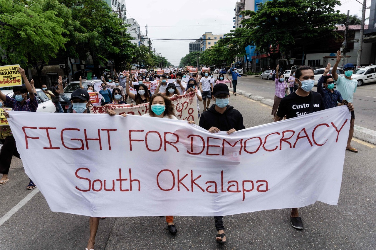 Protesters march with a banner during a demonstration against the military coup in Yangon, on April 30, 2021.