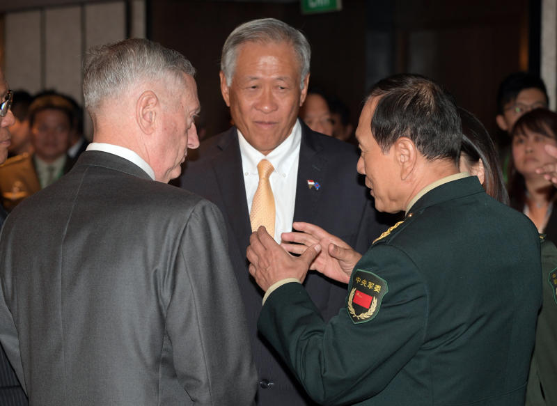 US Secretary for Defense James Mattis (left), and China's Minister of National Defense General Wei Fenghe (right) meet at a lunch hosted by Singapore Deputy Prime Minister Teo Chee Hean on Oct 20, 2018 at the Shangri-la Hotel Singapore.