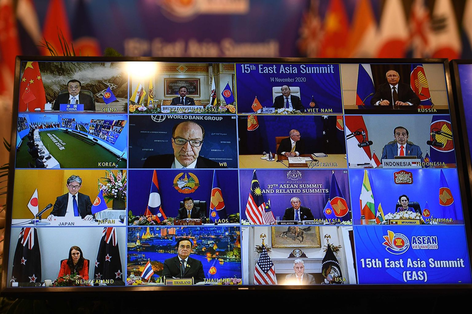 Vietnam's Prime Minister Nguyen Xuan Phuc (top second right) addresses his counterparts at the Asean-East Asia Summit on Nov 14, 2020.