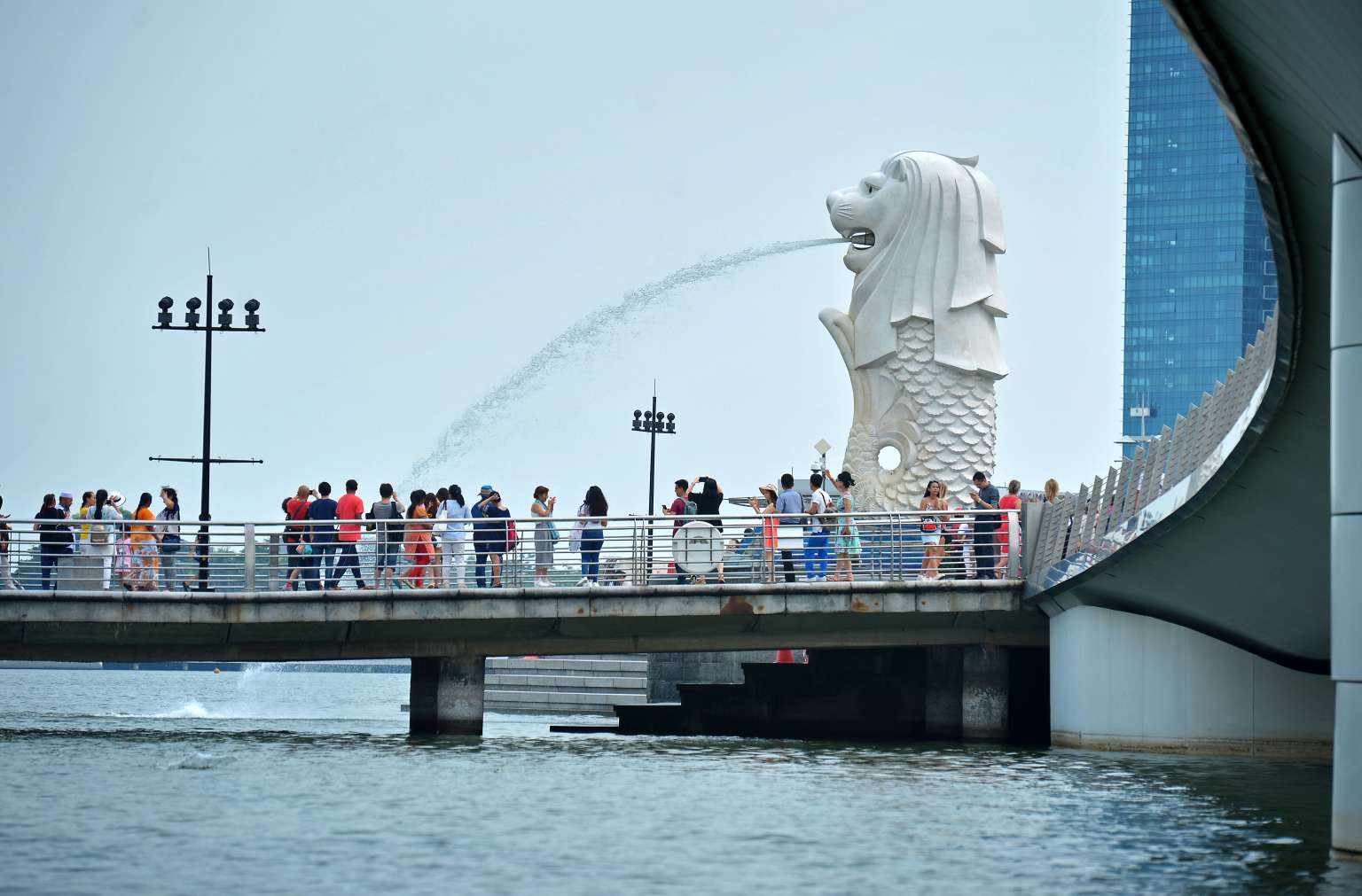 Tourists at the Merlion Park in Singapore.
