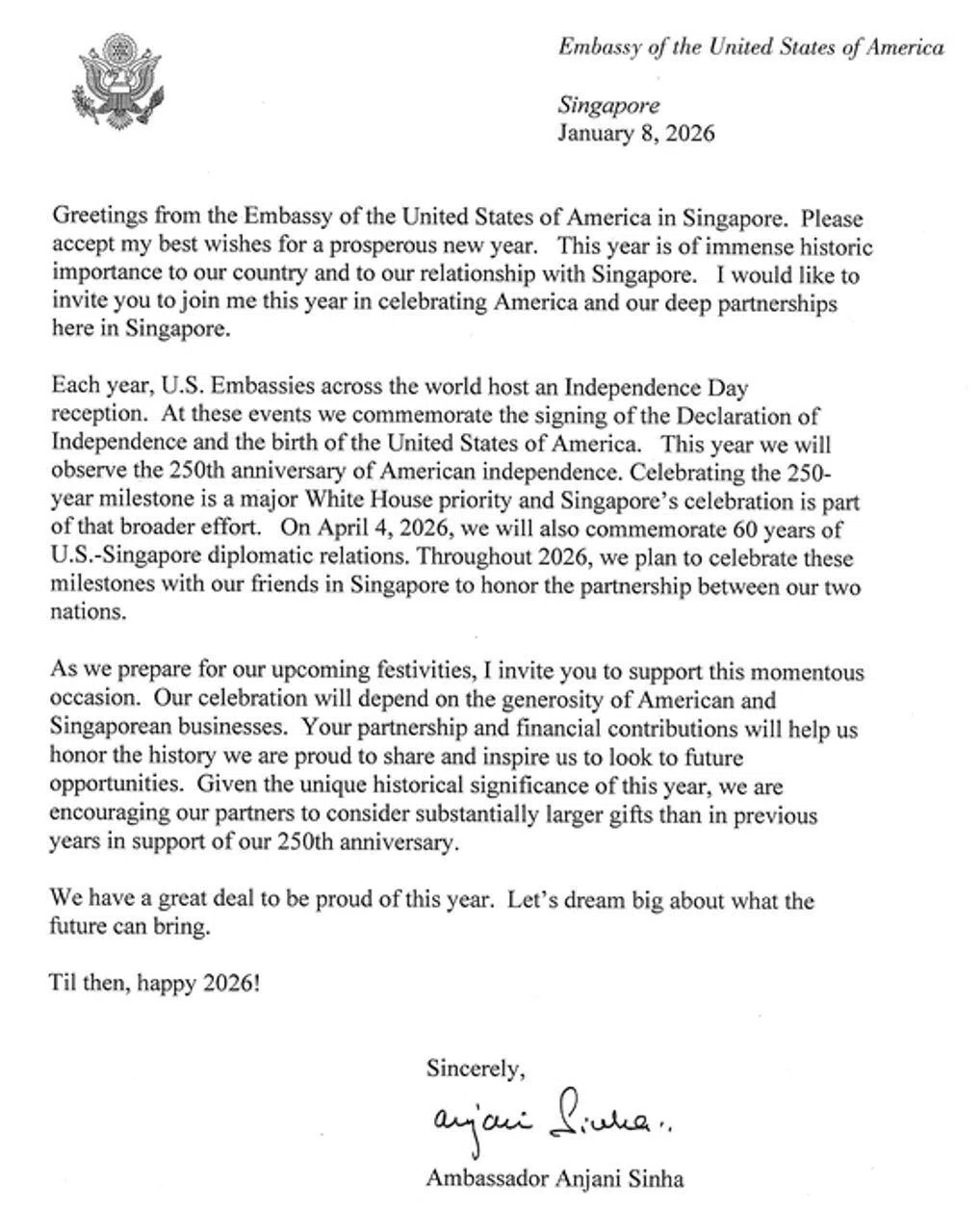 The US Embassy, in the letter signed off by Ambassador Anjani Sinha, referred to the 250th anniversary of US independence. It also referred to the 60th year of US-Singapore diplomatic relations, which it will mark on April 4.