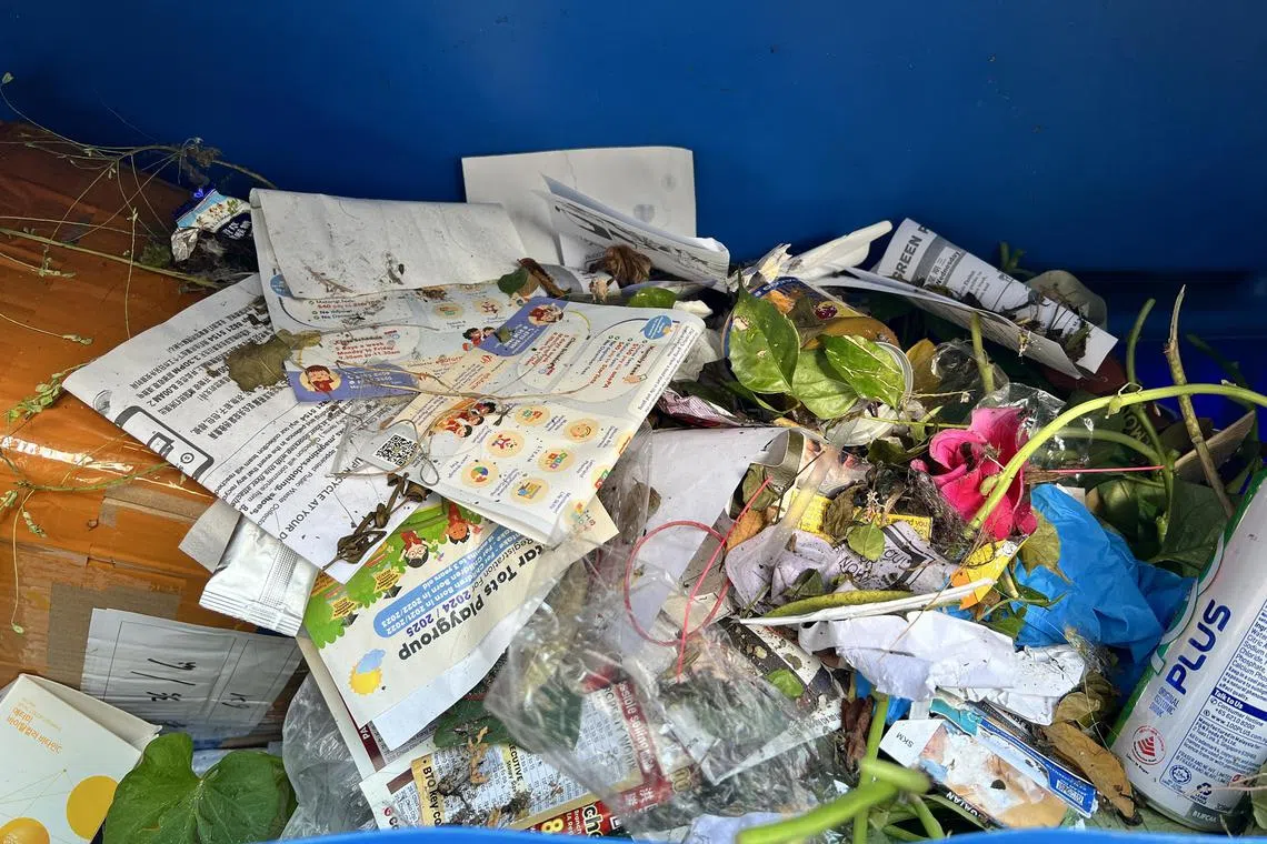 The contaminated contents of a blue recycling bin at Block 413 Choa Chu Kang Avenue 3.