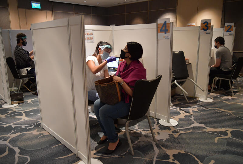 Hotel staff receiving the Covid-19 vaccine at the Raffles City Convention Centre on Jan 28, 2021.
