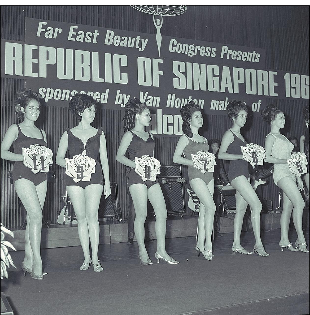 Some of the 10 semi-finalists of the 1969 Miss Republic of Singapore contest. The overall winner went on to vie for the Miss Universe title in Miami Beach.