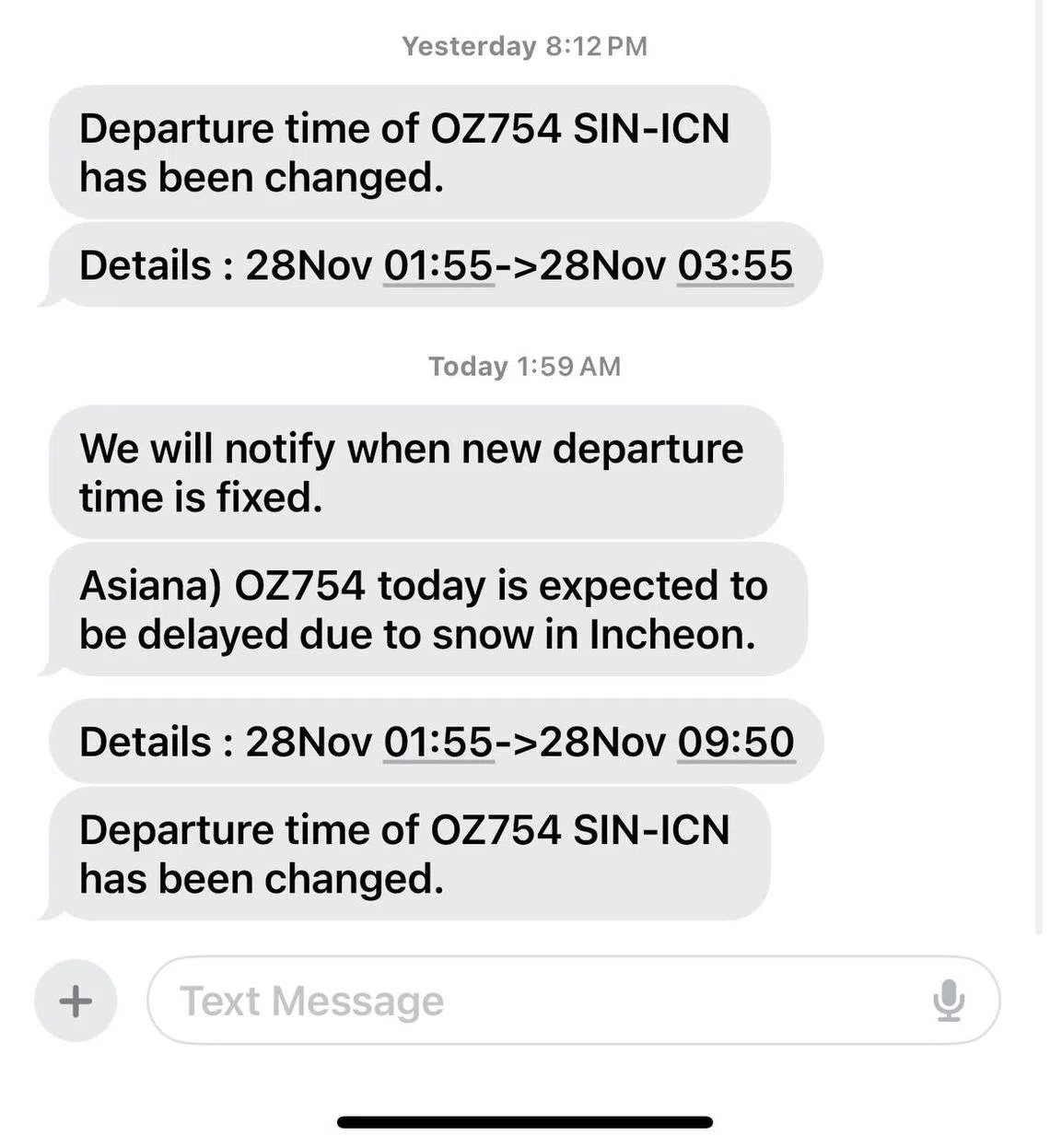 The flight he was on, SQ611, which was slated to take off at 12.35pm from Incheon Airport for Singapore, departed at 5.55pm.
