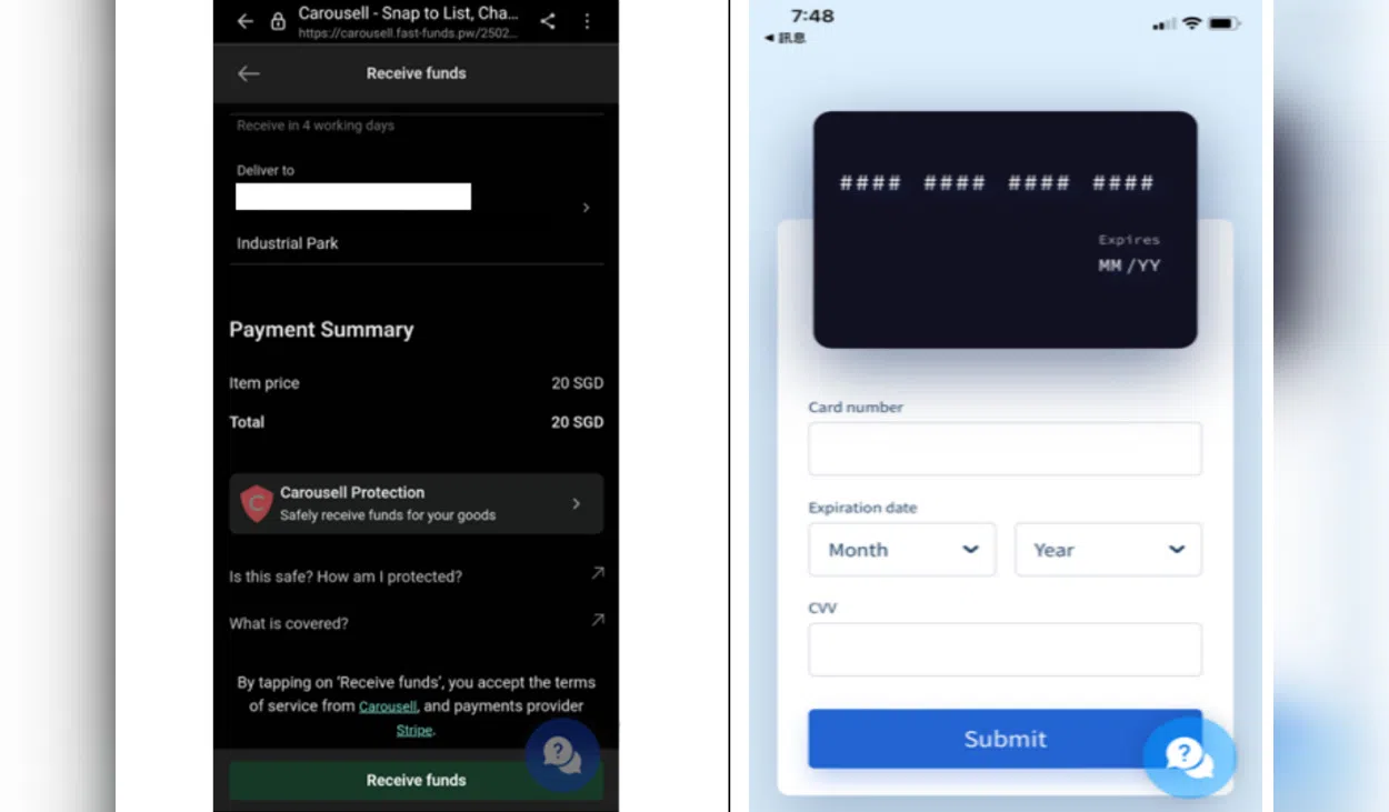 A spoofed Carousell Protection phishing website (left) and a phishing website (right).
