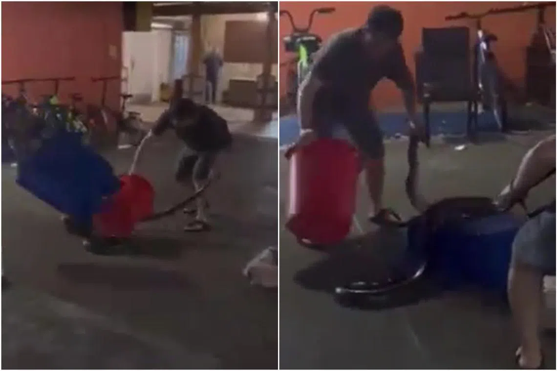 The video shows the men allegedly using plastic pails and crates to hit a reticulated python at Boon Lay Place Market and Food Village.