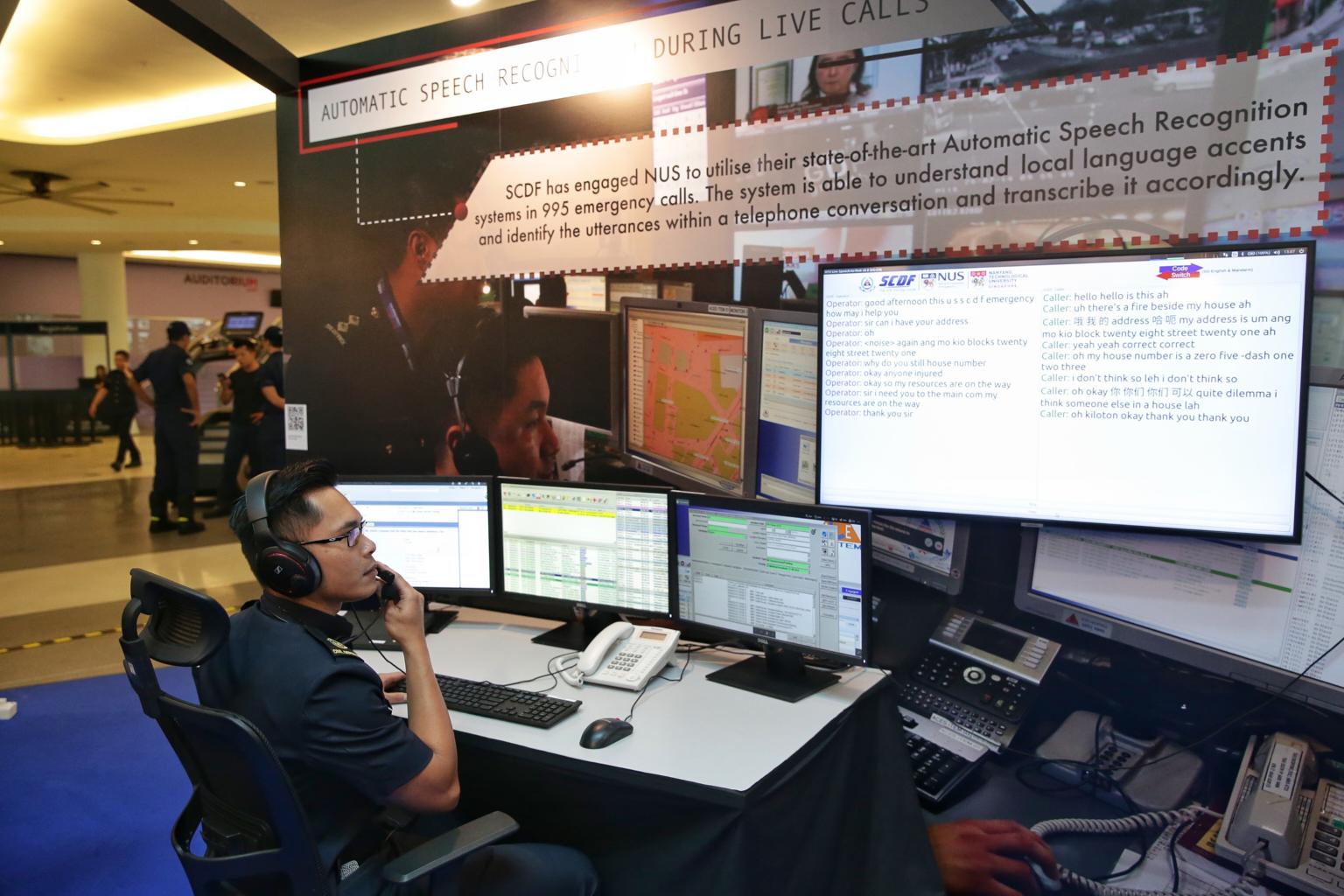 A demonstration of the automatic speech recognition system during live calls at the SCDF workplan seminar’s media preview at Singapore University of Technology and Design on May 8, 2019.
