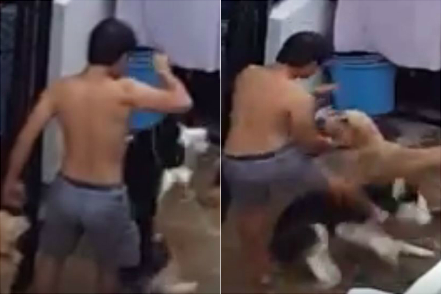 The man lifting the dog by its leash (left) and delivering a kick to the side of its head.