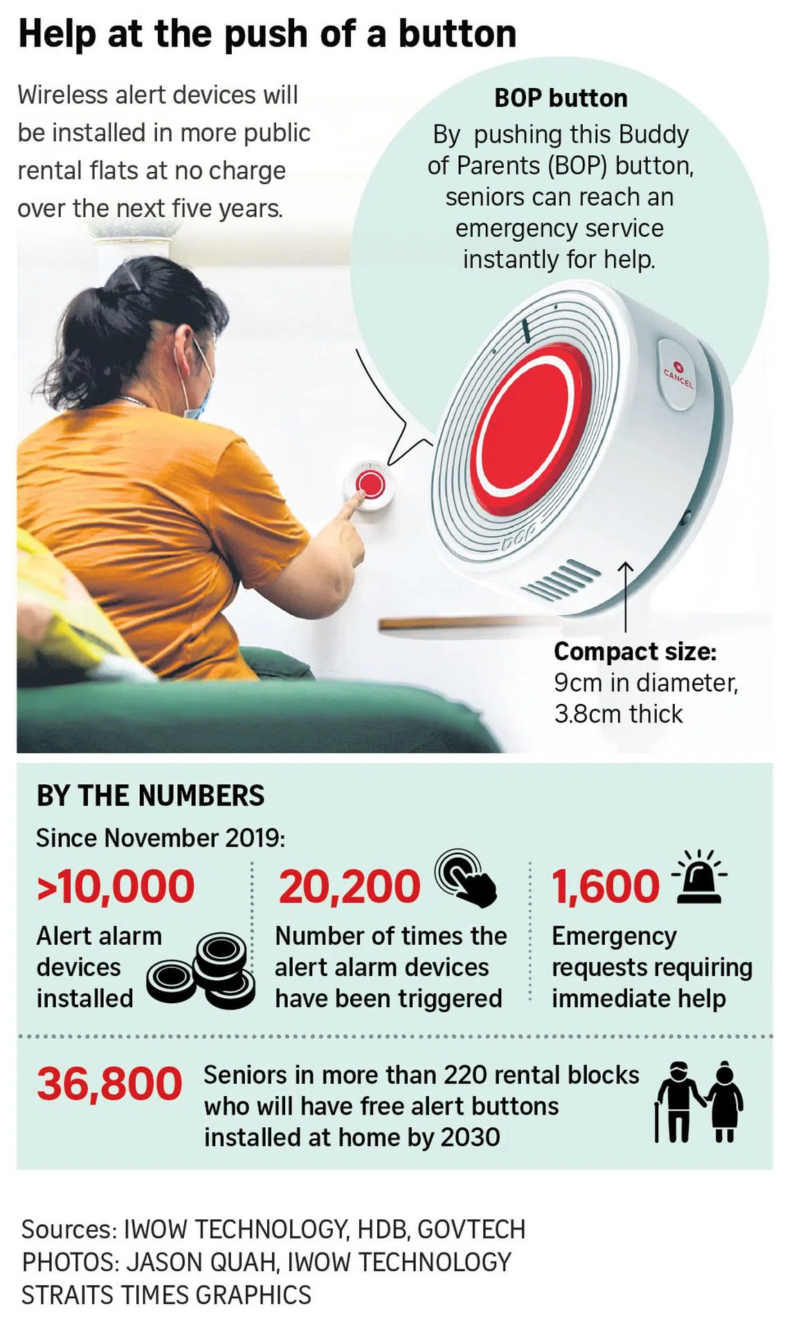 The button is an upgrade of an older pull-cord system, which seniors use to activate an alarm at their block’s void deck to alert people in the vicinity or an active ageing centre during working hours.