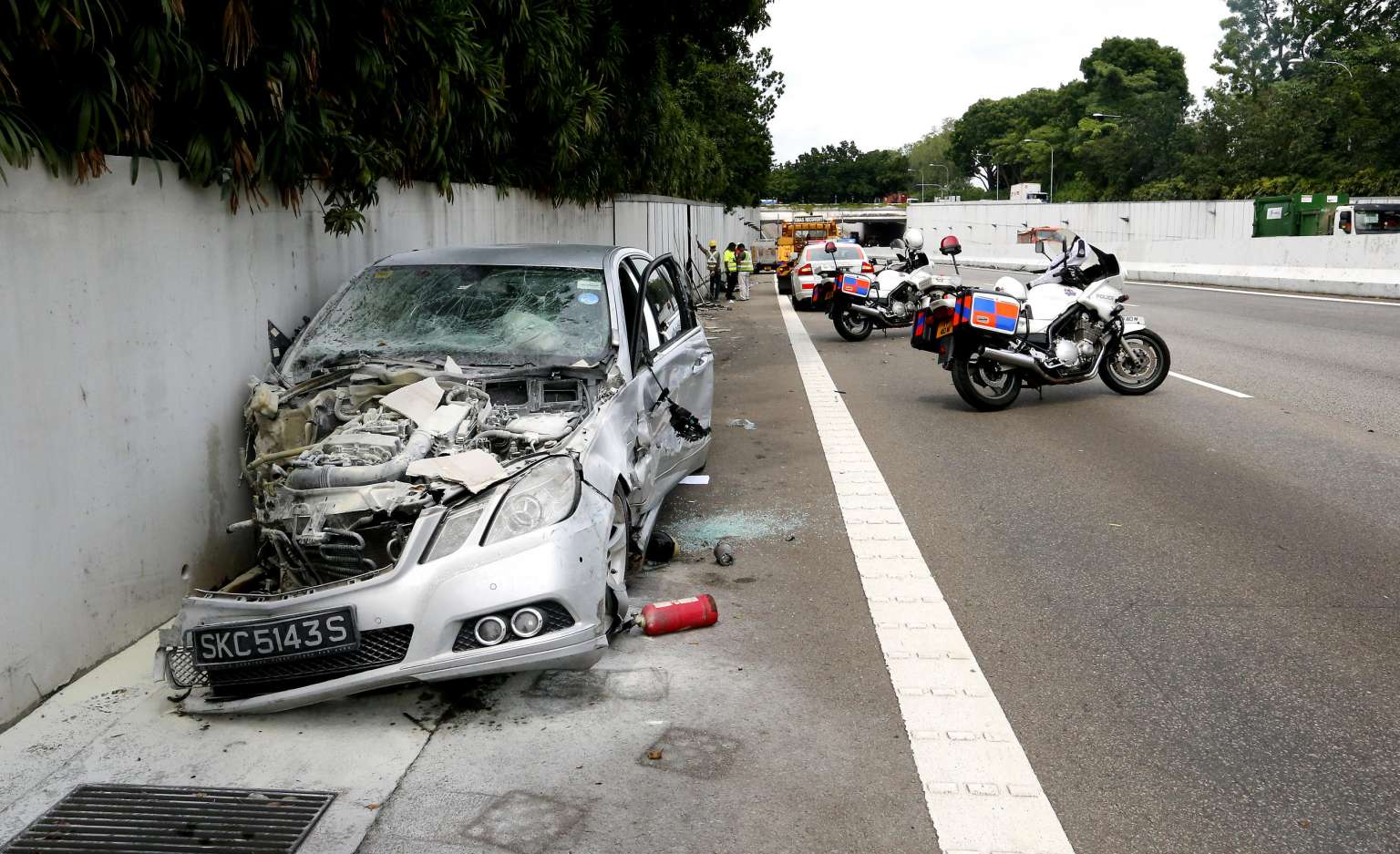 The Mercedes-Benz, which sparked the series of crashes on AYE, finally came to a stop after careening across three lanes, crashing into a motorcycle and hitting the wall by left-most lane.