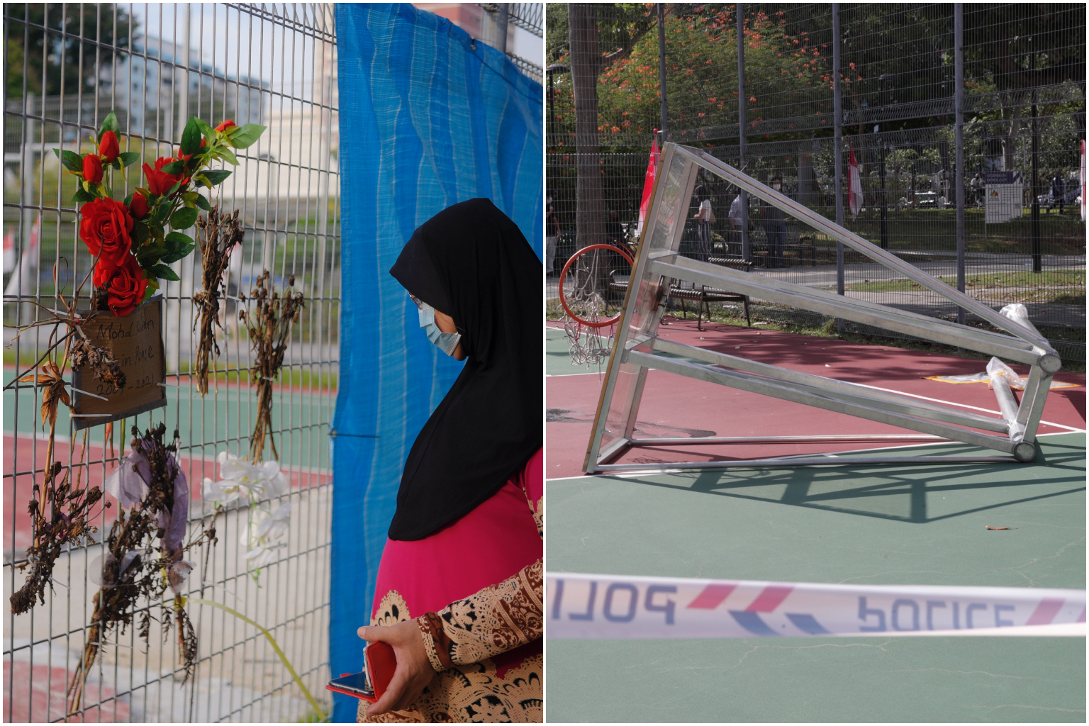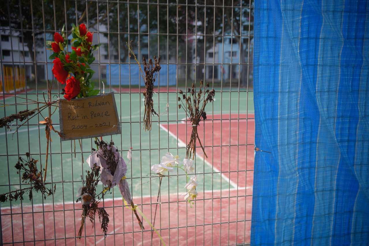 At one side of the side of the basketball court in Bedok South Avenue 1, flowers have been placed in his remembrance of the late Mohd Ridwan , on 9 September, 2021. The plastic red flowers were left by his mother a while back. She occasionally goes to the basketball court to see the flowers that have been left for her son.