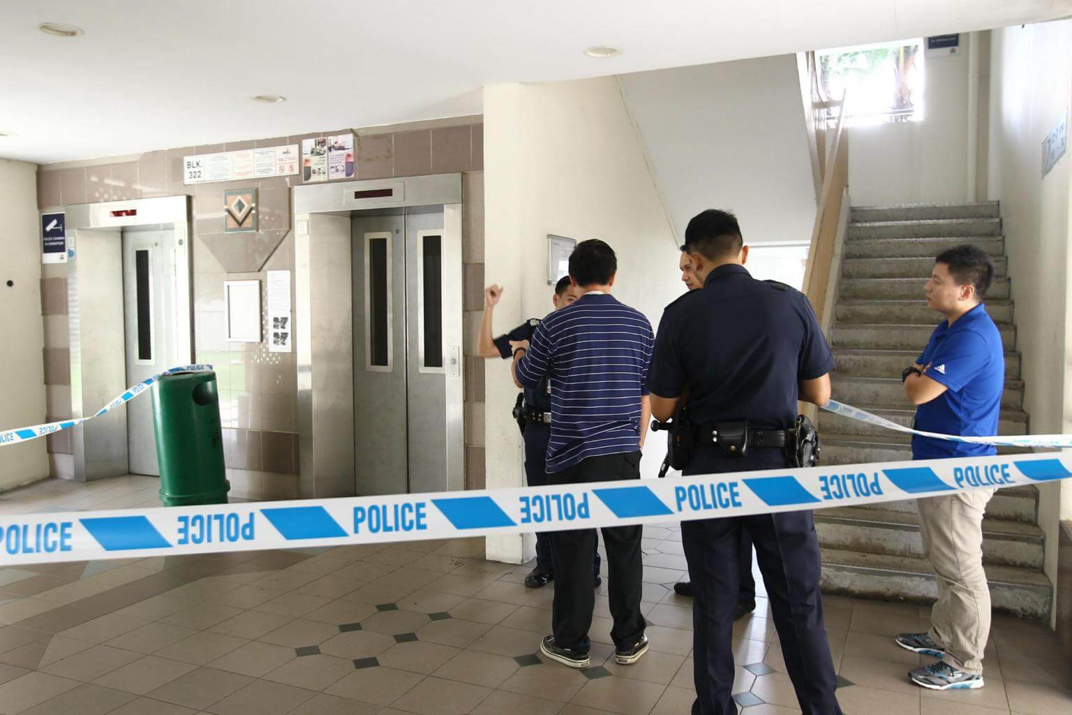 Policemen at the scene where an elderly woman’s hand was found outside the lift by Singapore Civil Defence Force rescuers at Tah Ching Road.