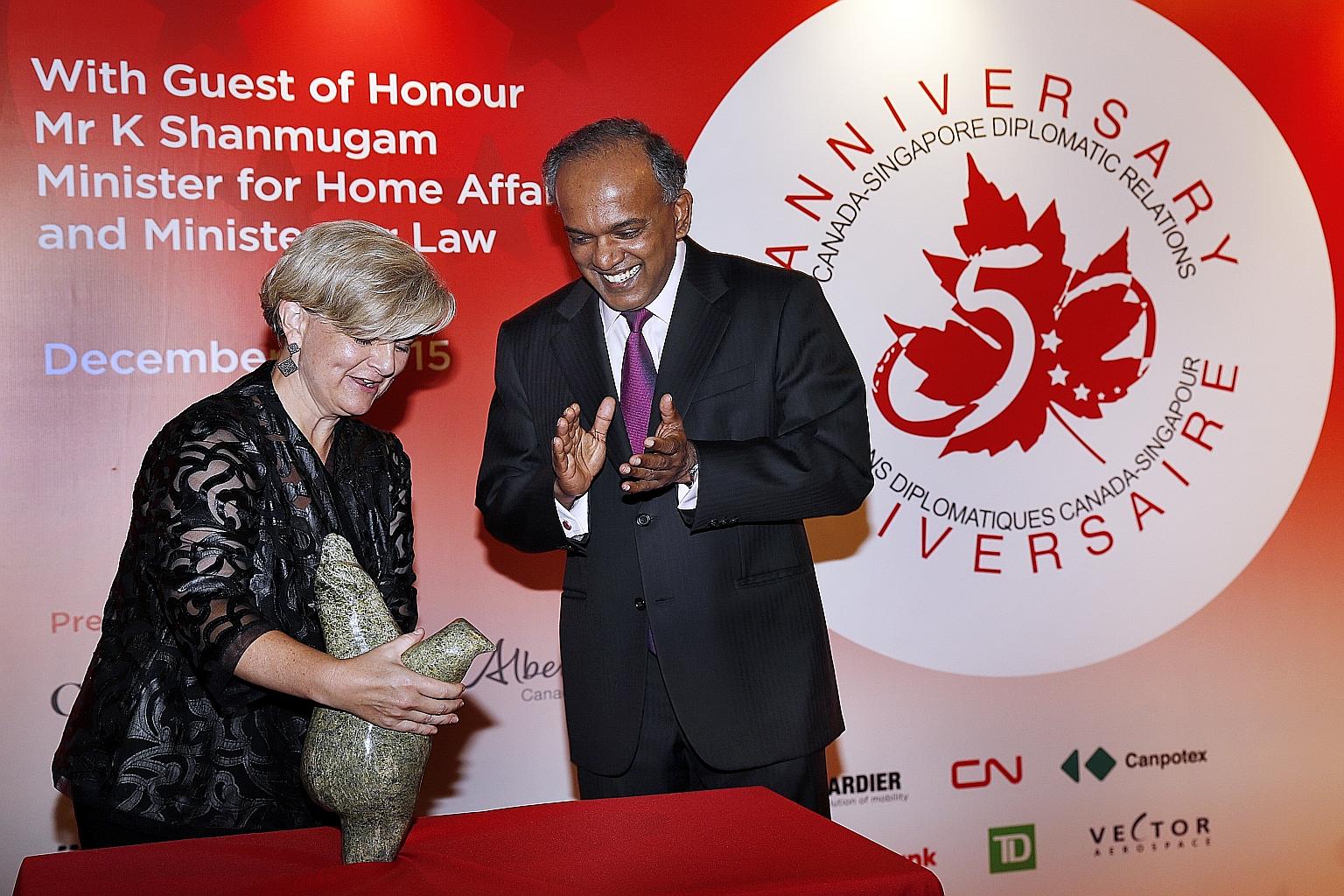 Singapore and Canada are separated by the Pacific Ocean, the world's largest oceanic divider, but their bilateral ties are closer than imagined. Two-way trade for both merchandise and services, for example, is now over $5 billion, said Canadian High Commissioner Heather Grant during an event at the Red Dot Design Museum in Tanjong Pagar last night. It celebrated 50 years of a "warm, substantive" friendship, said Law and Home Affairs Minister K. Shanmugam, the guest of honour. The High Commissioner presented Mr Shanmugam with a sculpture of a dancing bear, crafted by Inuit artist Noo Atsiaq, to mark the special occasion. She hoped the two countries "will build on the foundation of these first 50 years to pursue our many common interests", including a strong economy, clean environments and greater security.