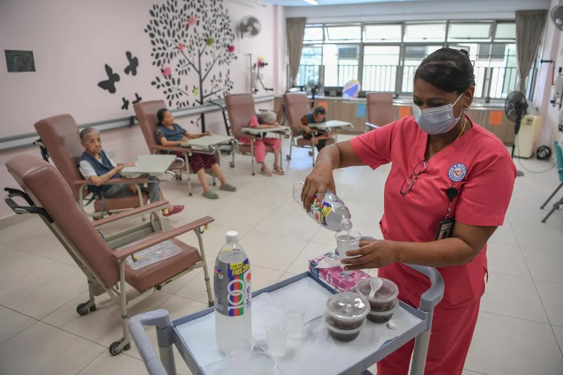 Cooling measures at the THK Nursing Home @ Hougang include the use of additional fans and coolers, the use of cooling seating pads and hydration regimes with drinks like 100plus and desserts.