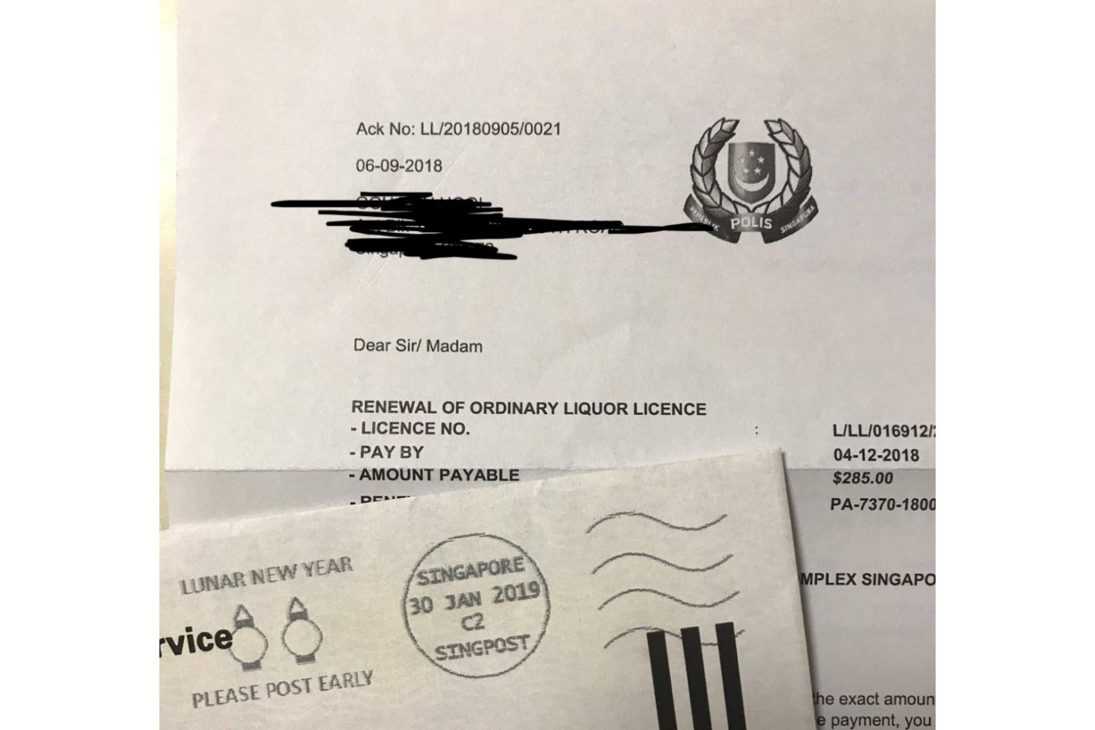 SINGAPORE - A letter from the police on renewing an alcohol licence appears to have taken four months after its stated date to reach the co-owner of a beer stall.