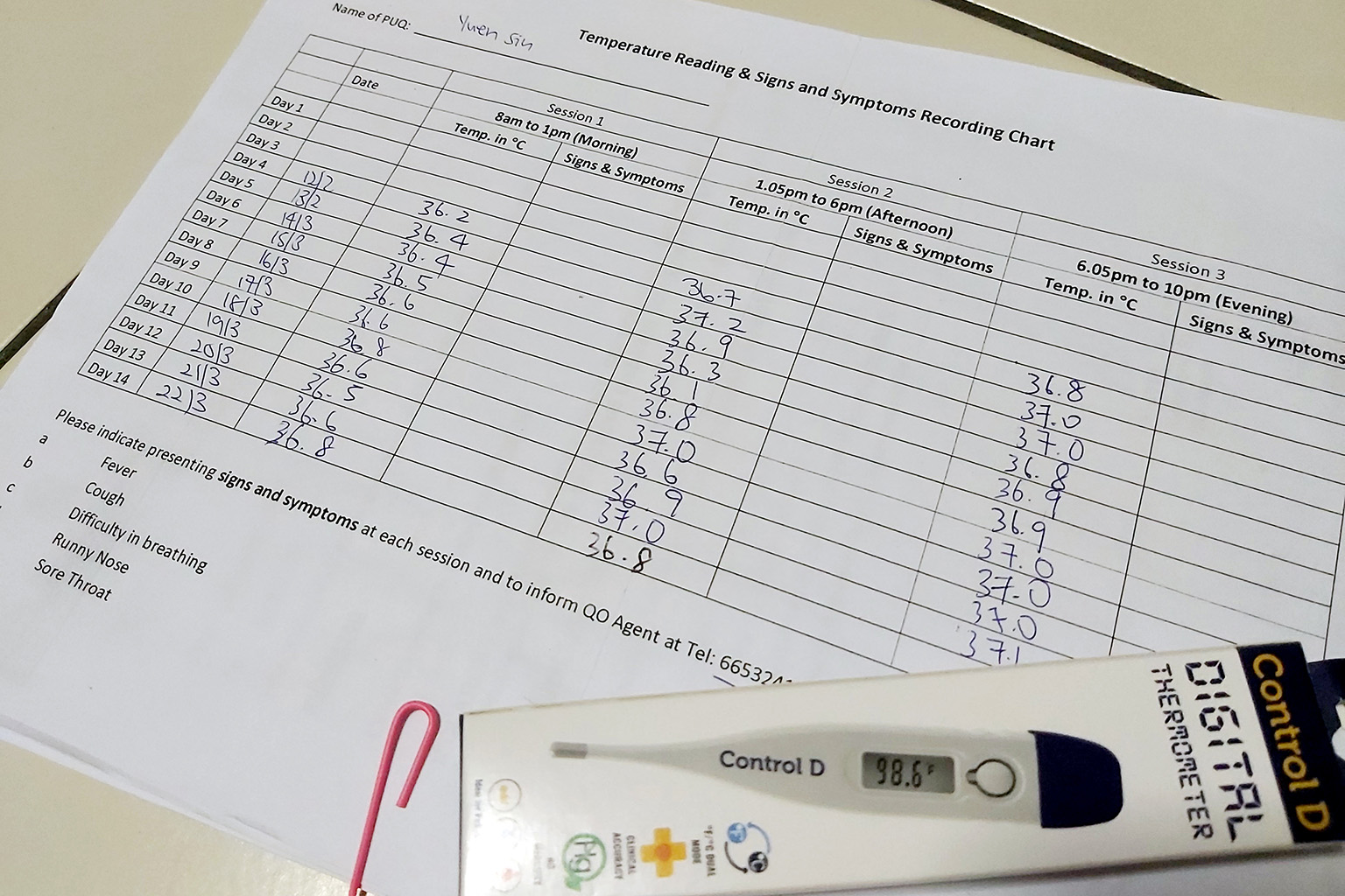 The writer’s temperature log, which she had to fill in three times a day, on top of monitoring herself for symptoms such as fever, sore throat and breathing difficulty, while she was quarantined at home.