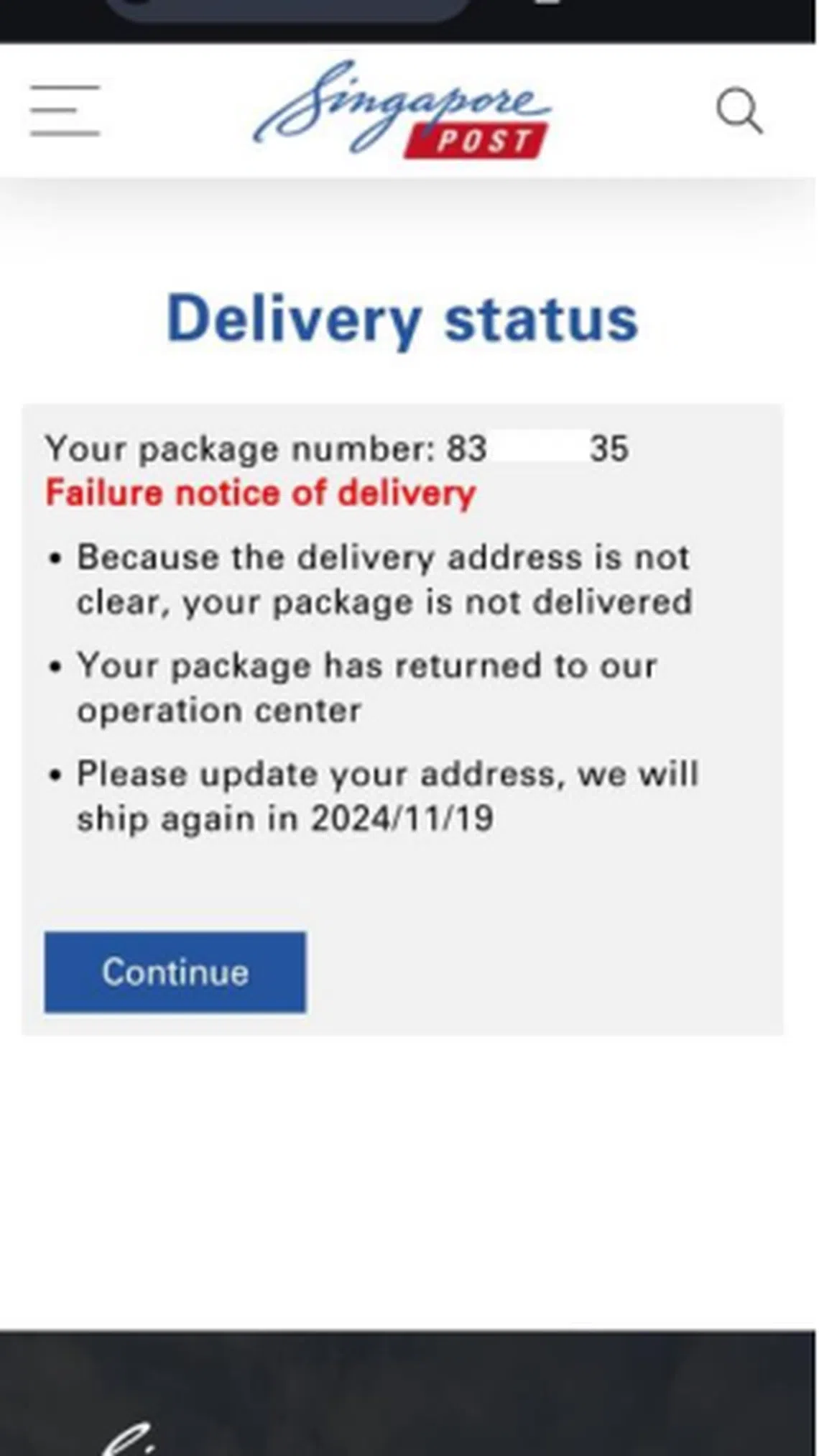 Victims of such scams would receive a message about a failed parcel delivery to their address that instructs them to click on a website link. Those who click on the link to confirm their address would be directed to a phishing site prompting them to key in their credit card details.