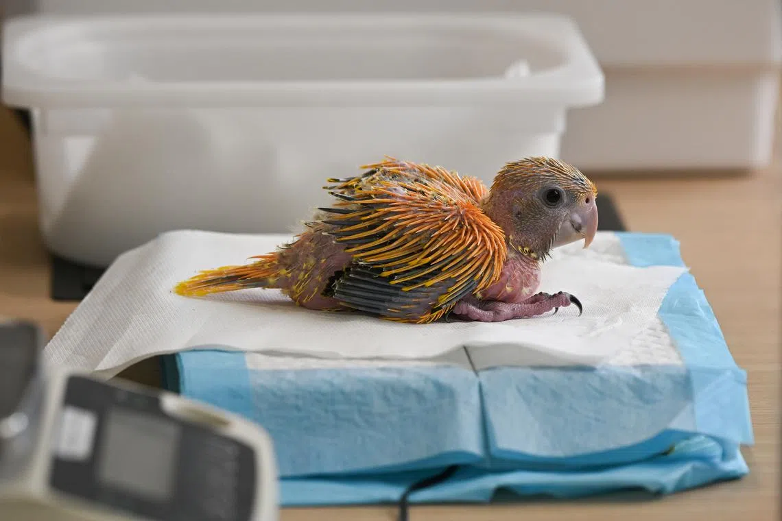 A golden conure chick in the nursery at the Bird Paradise’s breeding and research centre.