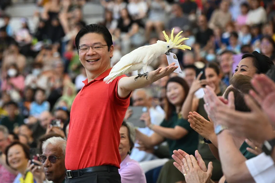 Sassy the Sulphur Crested Cockatoo delivering a postcard with the commemorative stamps to Deputy Prime Minister Lawrence Wong at the Sky Amphitheatre at Bird Paradise on Nov 15.