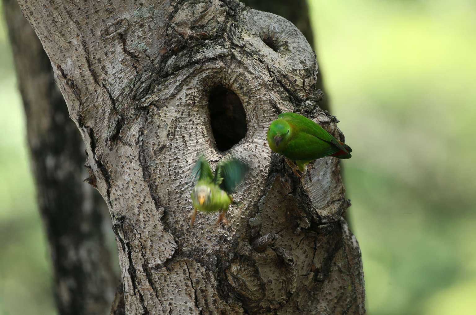 A Blue-Crowned Hanging Parrot takes its first flight as its mother looks on from their nest along Owen Road, next to Pek Kio Market and Food Centre.