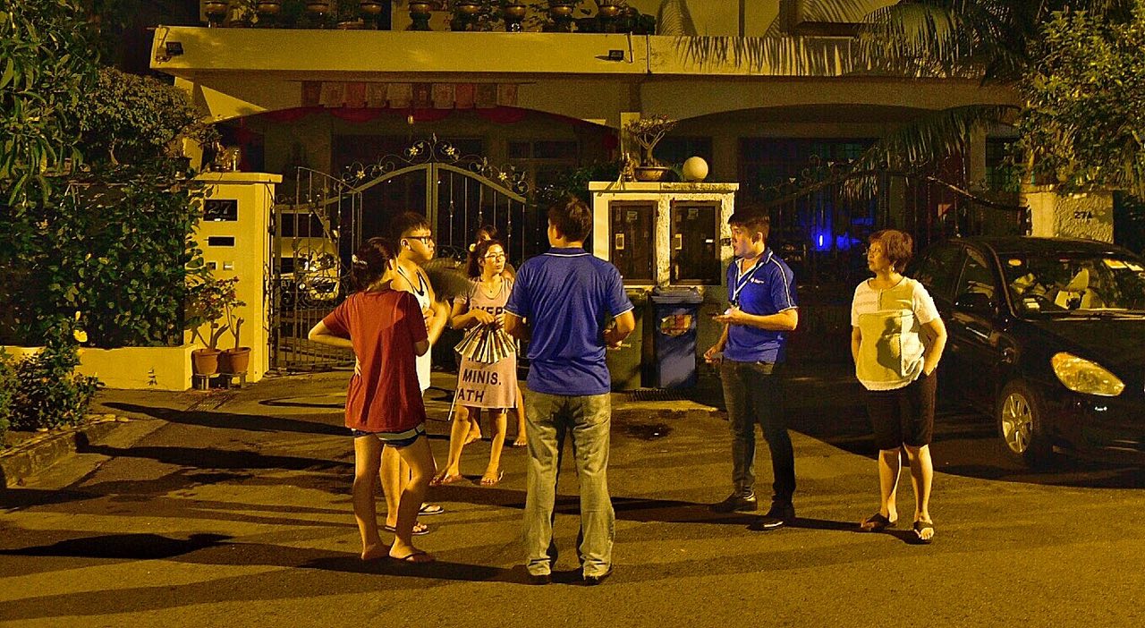 Two staff from the SP PowerGrid (in blue) helping residents along Jalan Senang.