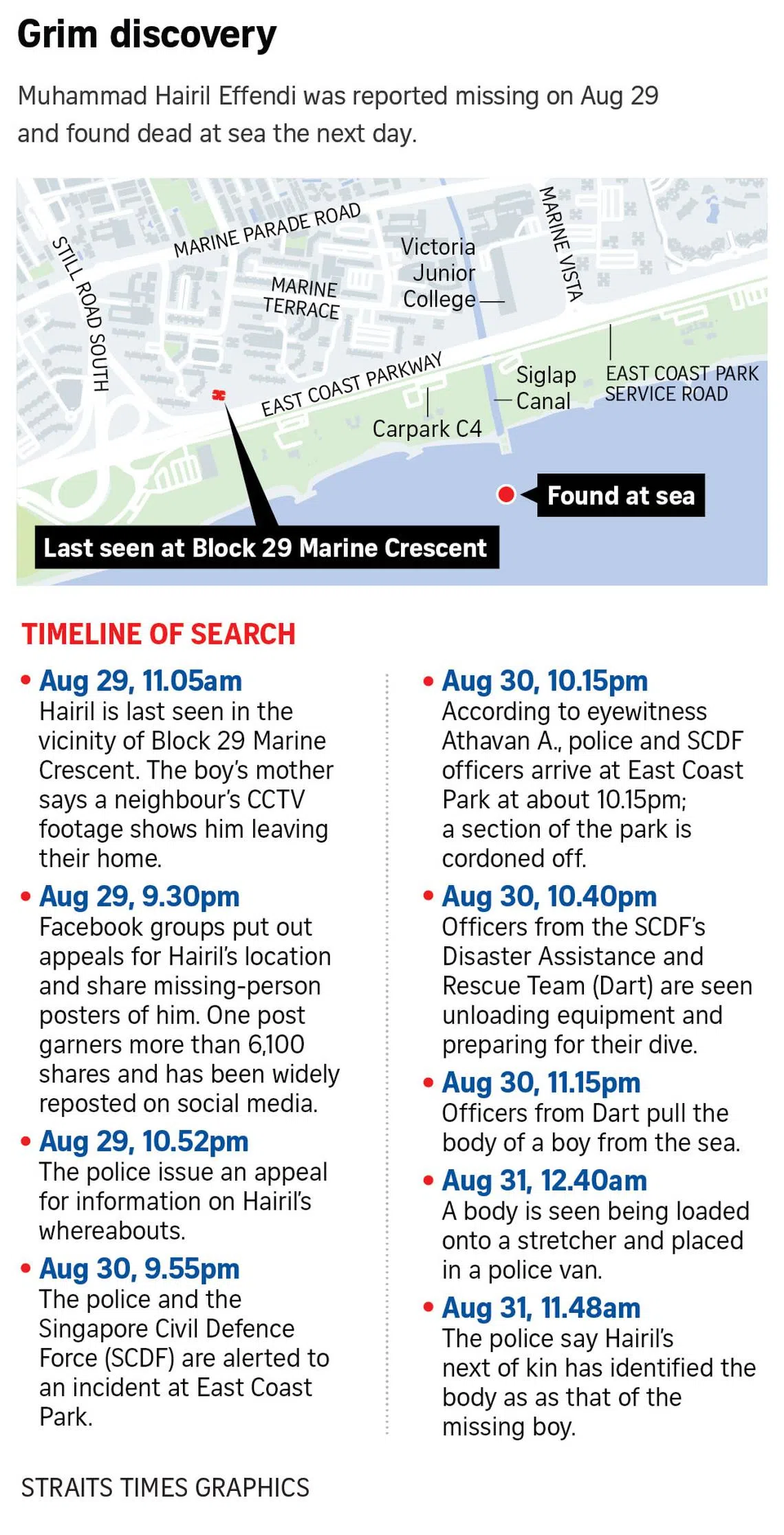 His body was found floating at sea off East Coast Park on Aug 30. Police said on Aug 31 that Hairil’s next of kin had identified the body to be his.