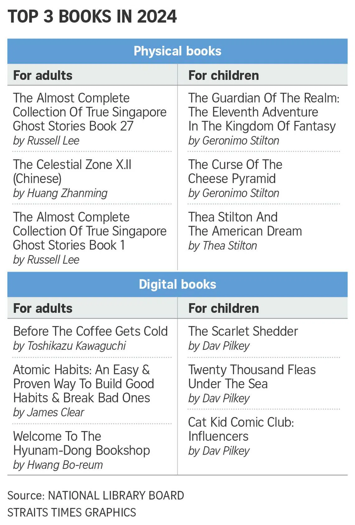 Books 27 and 1 of The Almost Complete Collection Of True Singapore Ghost Stories nabbed the first and third spots respectively in the adult category of the top three physical books borrowed.