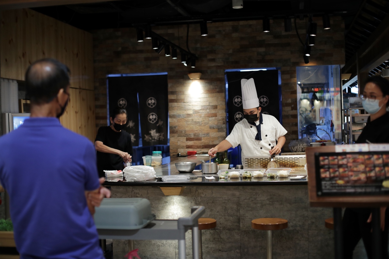 A chef prepares takeaway meal for a customer at a restaurant in Northpoint City on June 10, 2021.