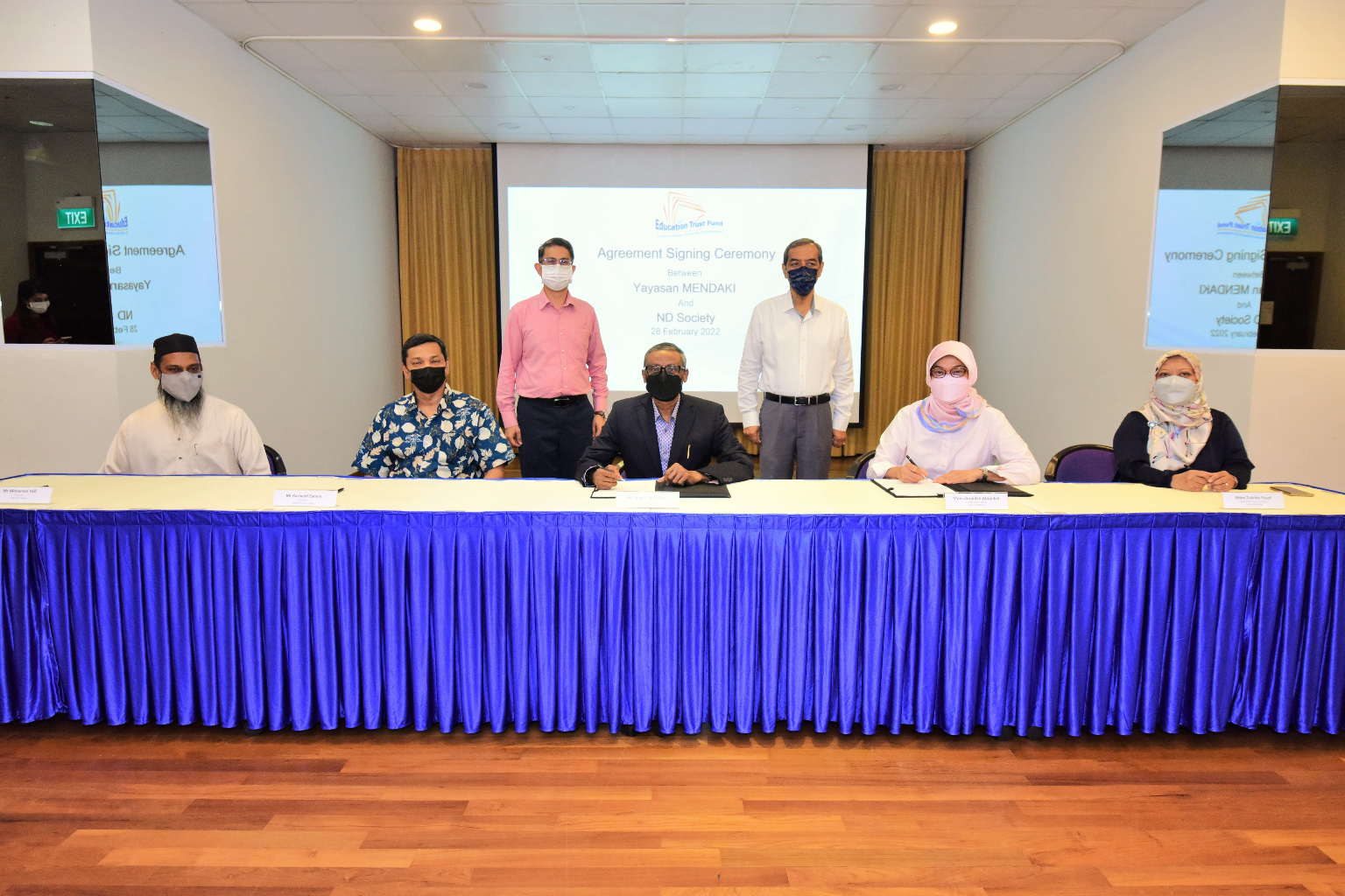 Minister of State Muhammad Faishal Ibrahim (standing, left) witnessing the agreement signing between Mendaki and ND Society.