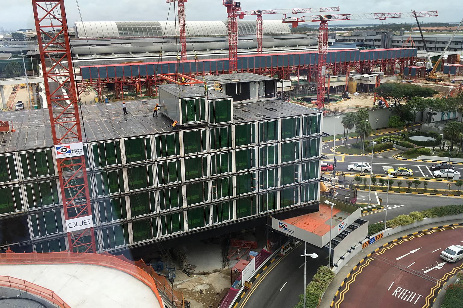 It will take just a month for the top nine storeys of the new Crowne Plaza Changi Airport hotel extension to rise, as its rooms are stacked and slotted together like building blocks.