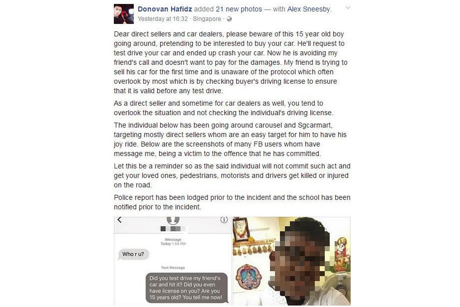 Facebook user Donovan Hafidz warned car sellers and car dealers in a post on Tuesday (Jan 24) to "beware of this 15-year-old boy going around, pretending to be interested to buy your car".