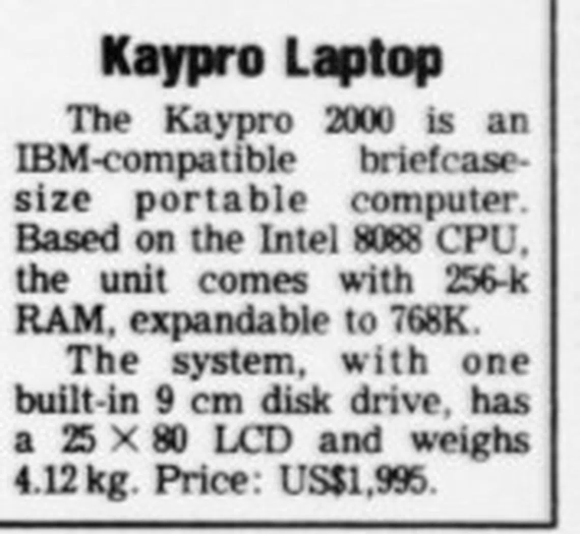 In those days, the word “laptop” was not common parlance. One of the first mentions of the word appeared on May 13, 1985, in Section Two. It was used to describe the Kaypro 2000, a 4.12kg IBM-compatible briefcase-size portable computer, which was selling for a hefty US$1,995.