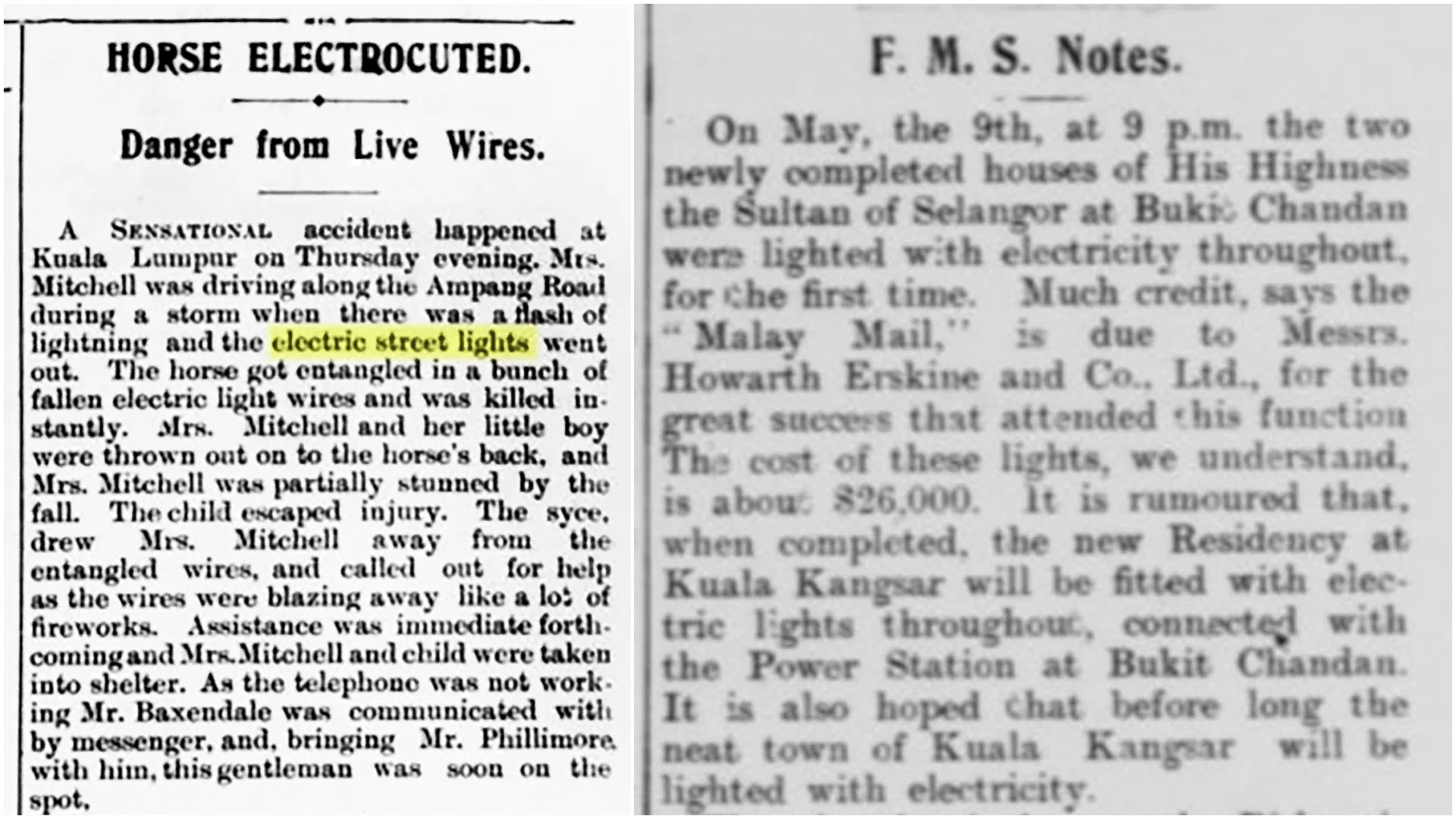 By 1906, electricity had come to the region, with a report on May 2 that year describing a tragic accident in Kuala Lumpur, in which a horse was electrocuted by falling electric light wires and killed instantly.