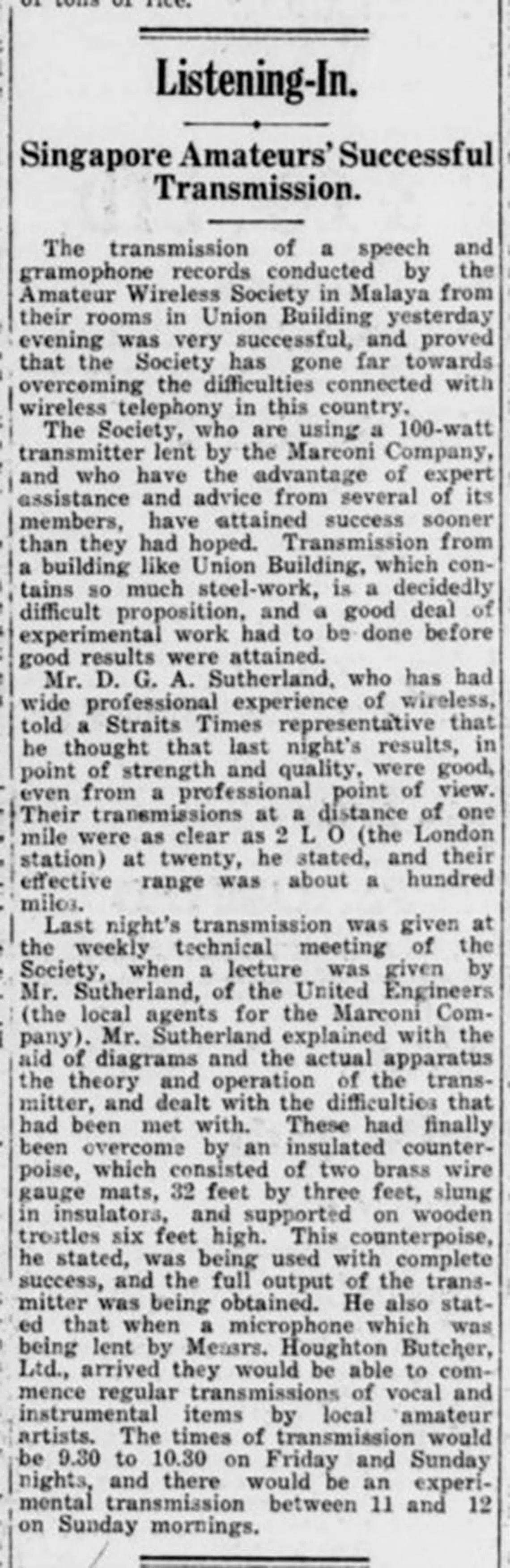 An article on Page 9 on May 7, 1925, about the Amateur Wireless Society of Malaya, an interest group comprising mostly European expatriates, successfully transmitting a speech and sounds from a gramophone from their rooms at the Union Building in Collyer Quay.