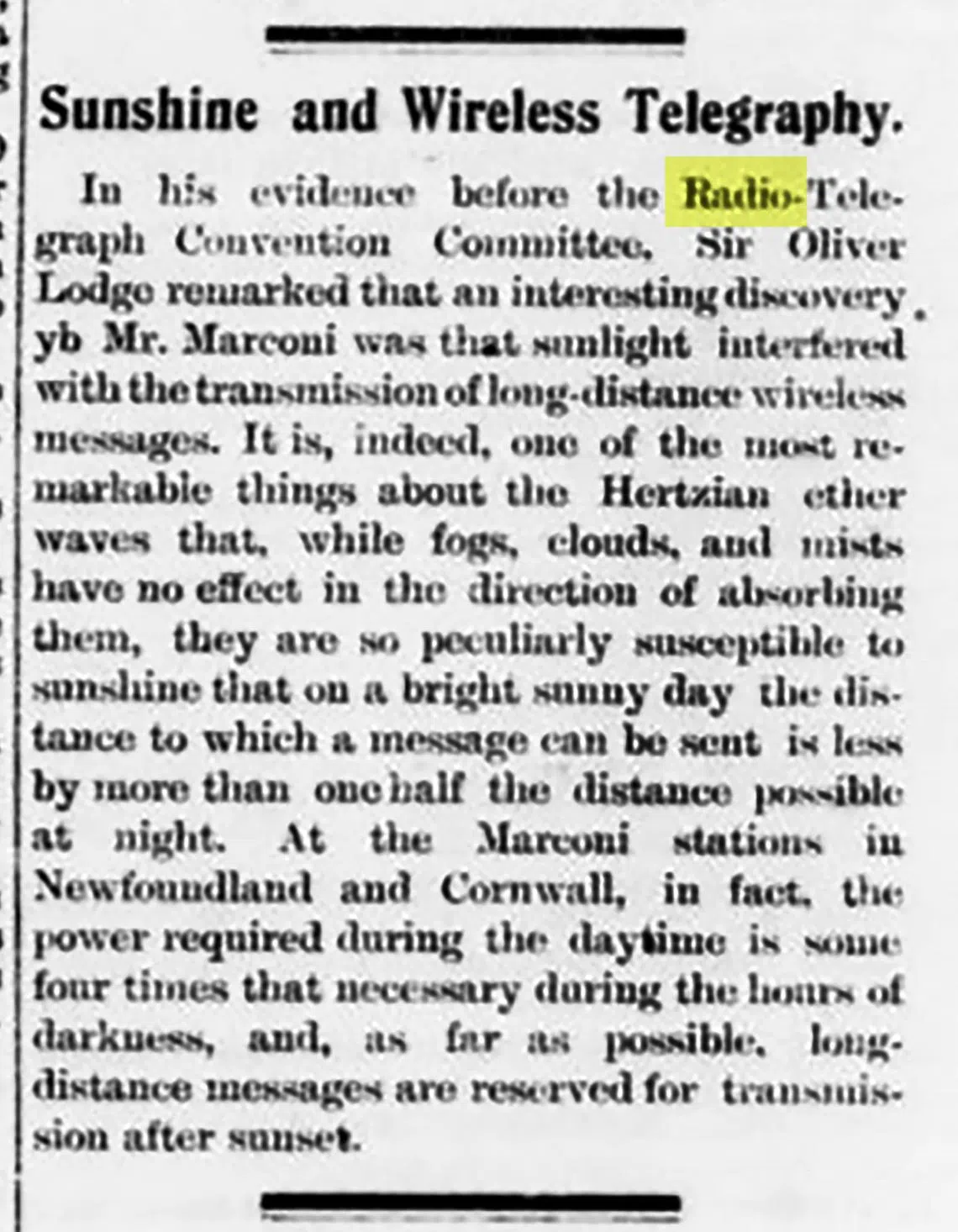 One of the early mentions of “radio” appeared on May 23, 1907, in an article about Britain’s Radio-Telegraph Convention Committee. The article highlighted an intriguing “discovery” – that sunlight, unlike fog or mist, could disrupt long-distance wireless signals. It noted that messages could travel twice as far at night compared with a sunny day.