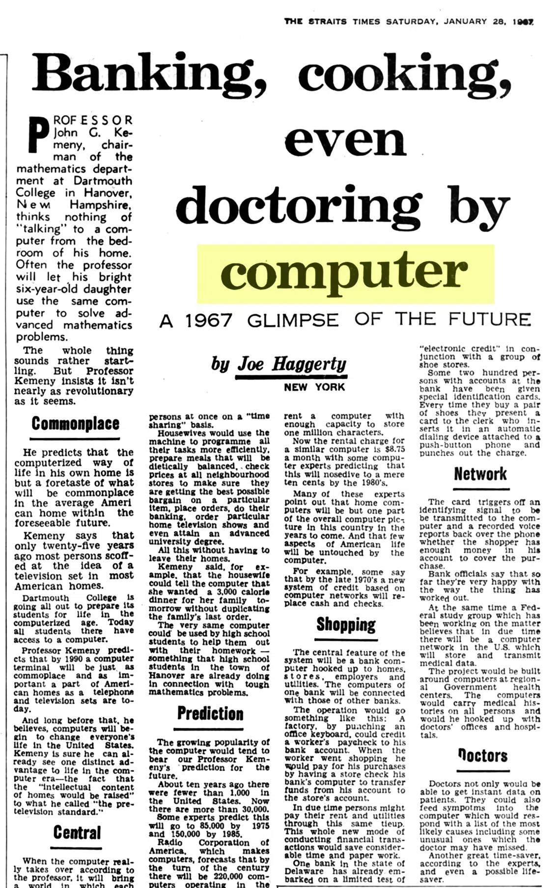 This digital transformation was predicted as early as 1967 by American mathematician John G. Kemeny. In a Straits Times report on Jan 28 that year, Kemeny forecast that by 1990, computers would be as common in homes as telephones and TVs, and used for chores such as shopping and banking. He was spot on.