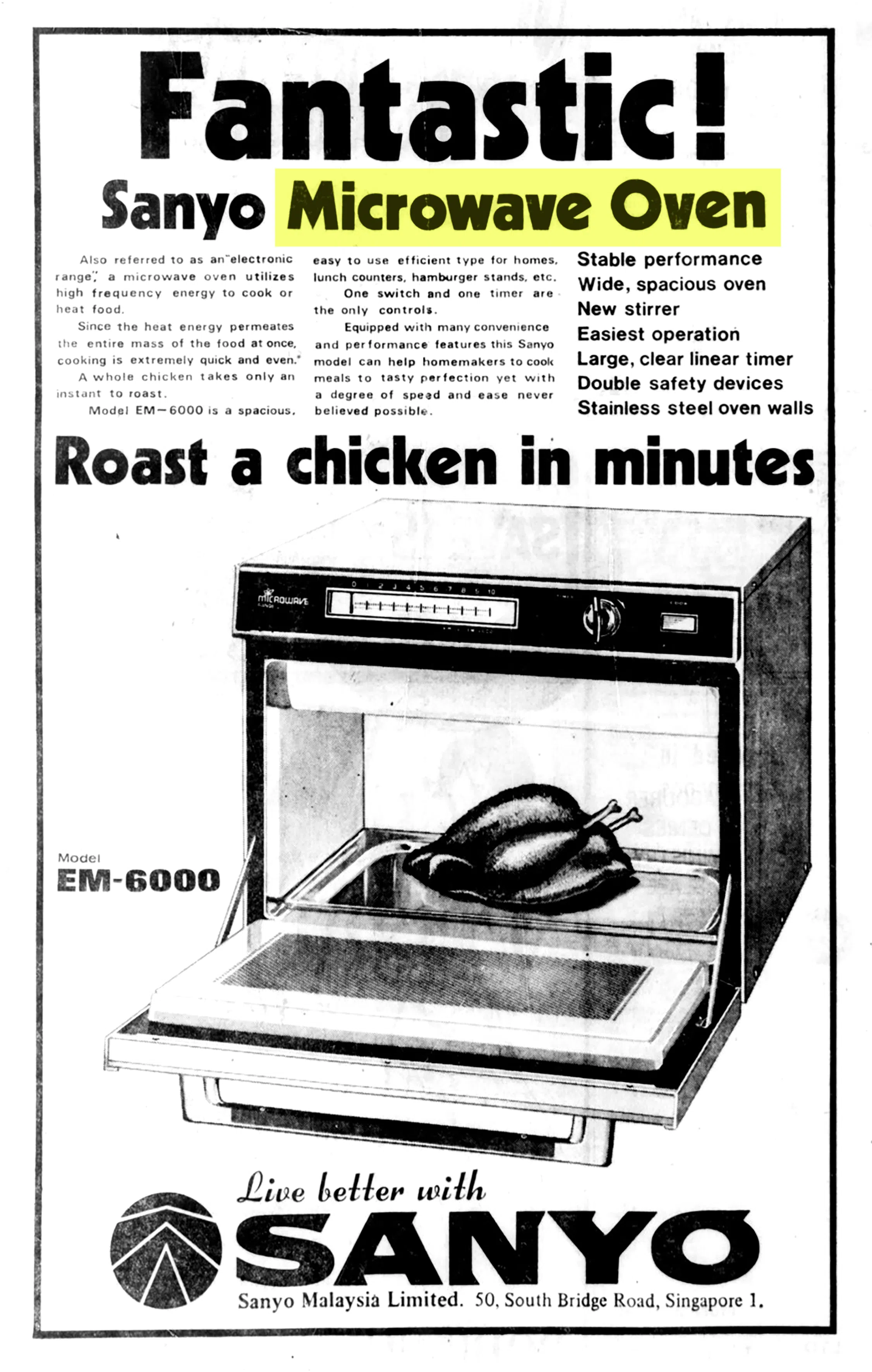 Japanese electronics manufacturer Sanyo took out an ad on Page 8 of the Feb 22, 1970, edition to explain how a microwave oven worked and promised “Roast a chicken in minutes”.