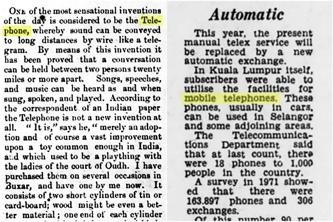 Among the first mentions of “telephone” in The Straits Times was on May 12, 1877, when the device was considered to be “one of the most sensational inventions of the day”. Just over a month after Motorola demonstrated the use of the first handheld mobile phone in New York, the words “mobile telephone” appeared in The Sunday Times’ May 20, 1973, edition (right).