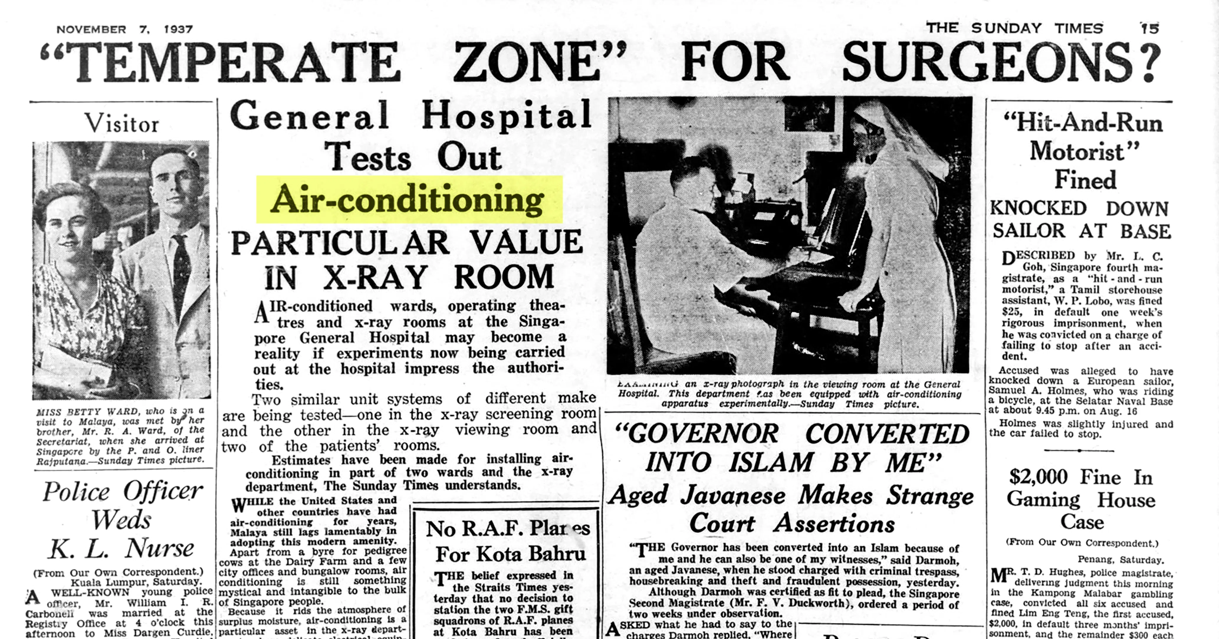A Page 15 article on Nov 7, 1937, for example, said: “Air-conditioned wards, operating theatres and X-ray rooms at the Singapore General Hospital may become a reality if experiments now being carried out at the hospital impress the authorities.”